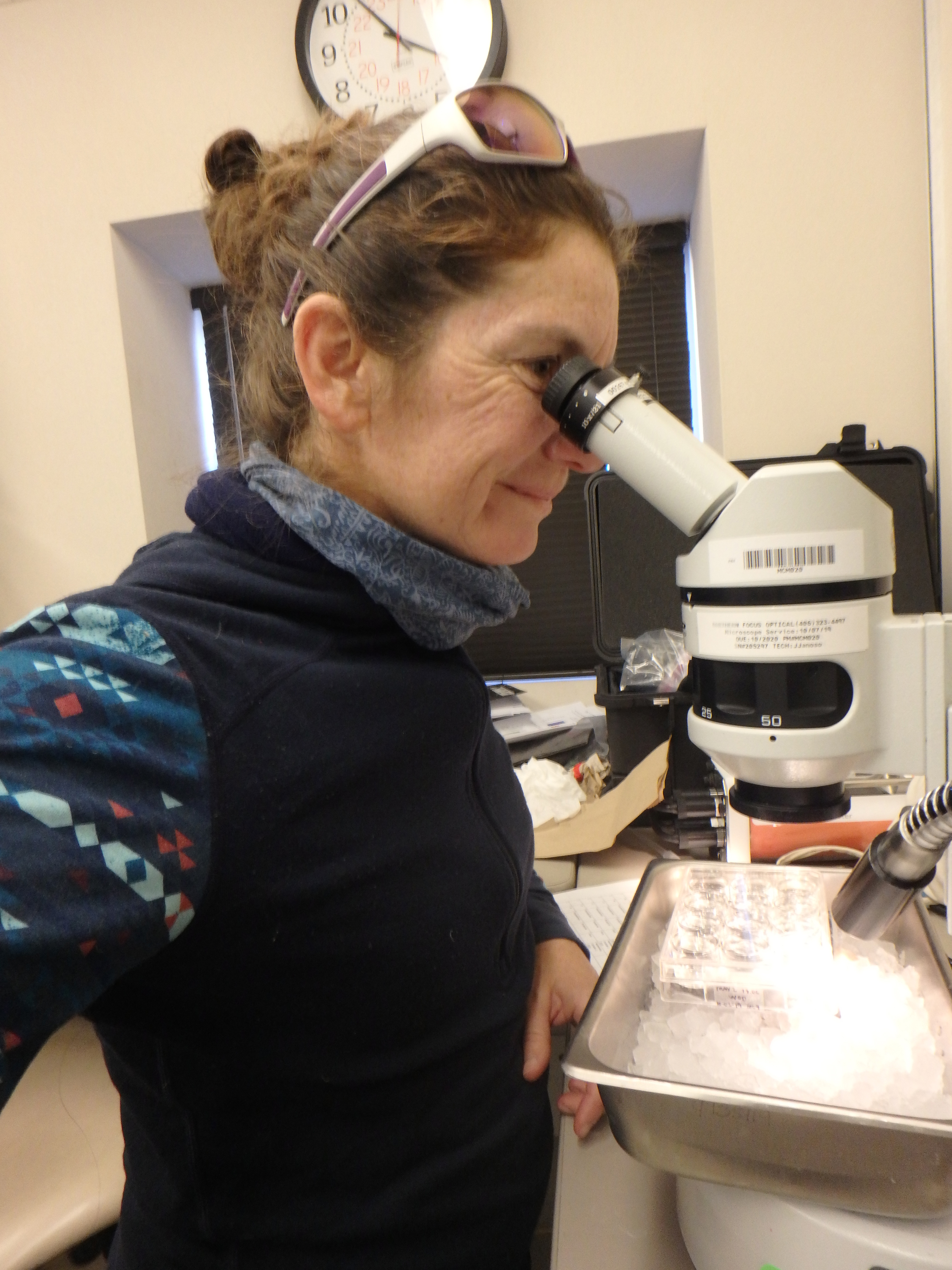 Amy Osborne helps identify stages of nudibranchs in trays under a microscope. Crary Lab, McMurdo Station, Antarctica.