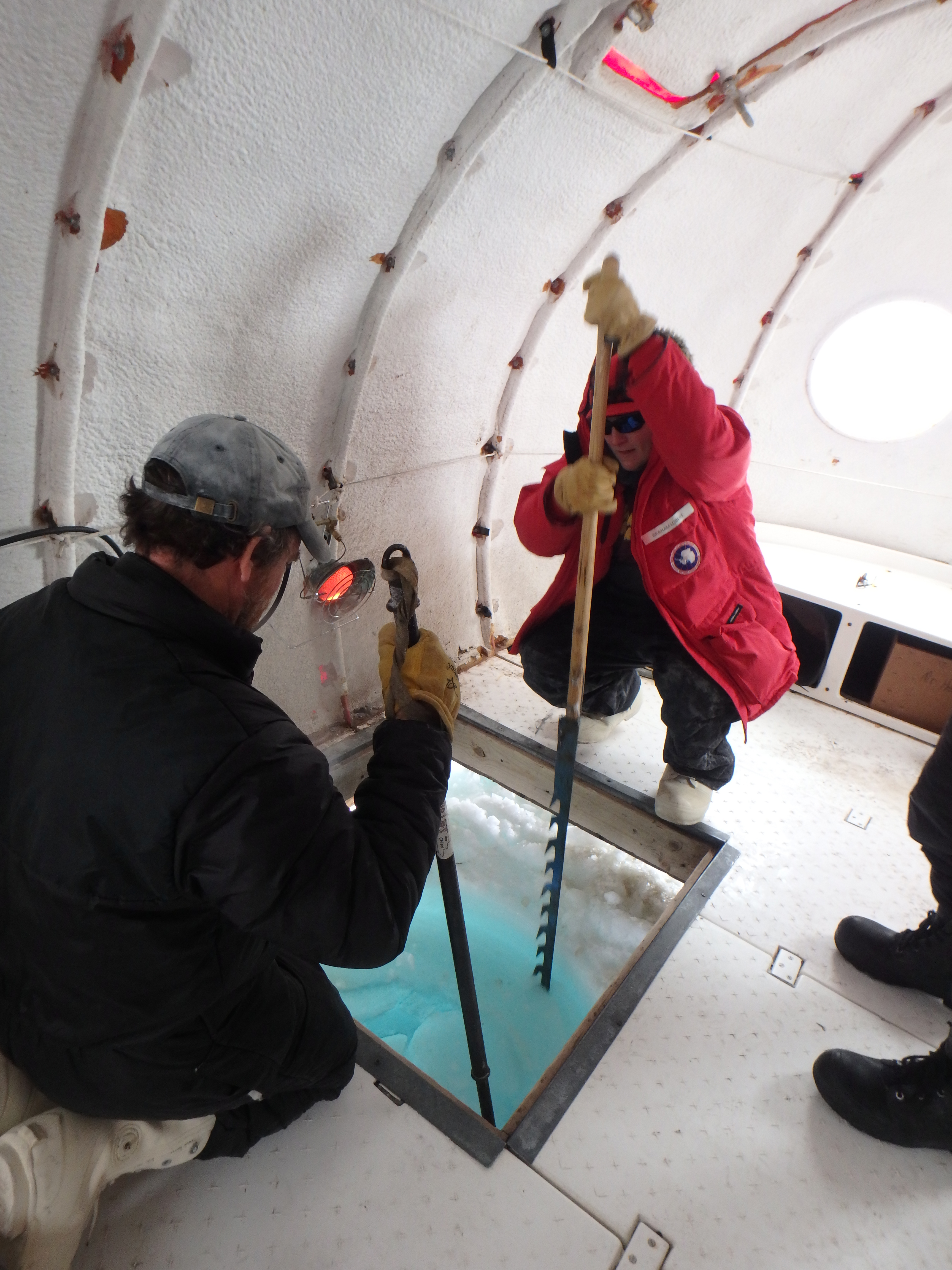 Graham Lobert and Rob Robbins cut and clear ice out of a dive hole. Since the tomato/apple dive huts are less insulated, they get much colder and the dive holes often freeze over. Cape Evans, Antarctica.