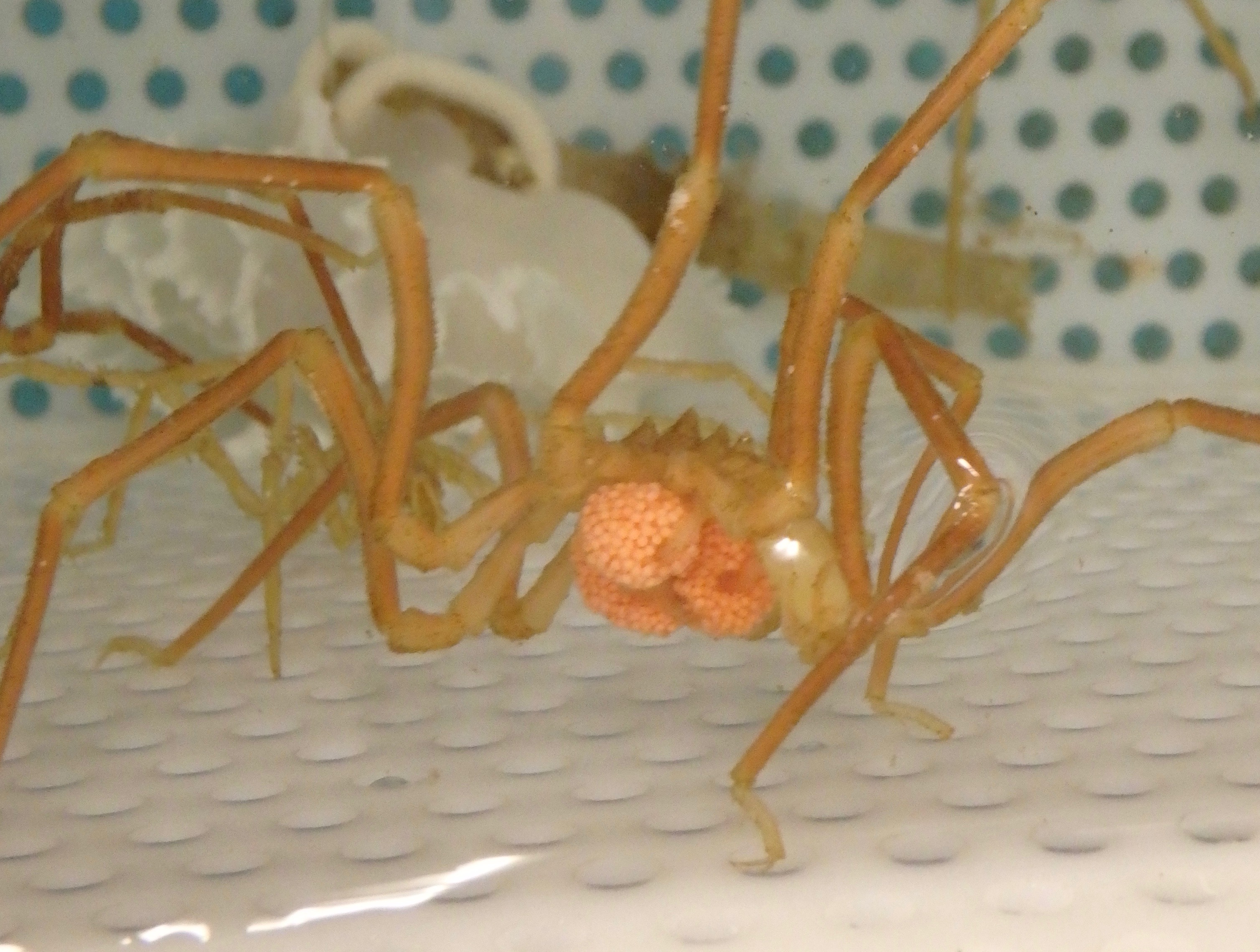 A male sea spider (genus Ammothea) carries eggs. These eggs are studied by researchers on the Marine Ectotherm Research Team to better understand the impacts of increasing ocean temperatures on the development of these animals. Crary Lab, McMurdo Station, Antarctica.