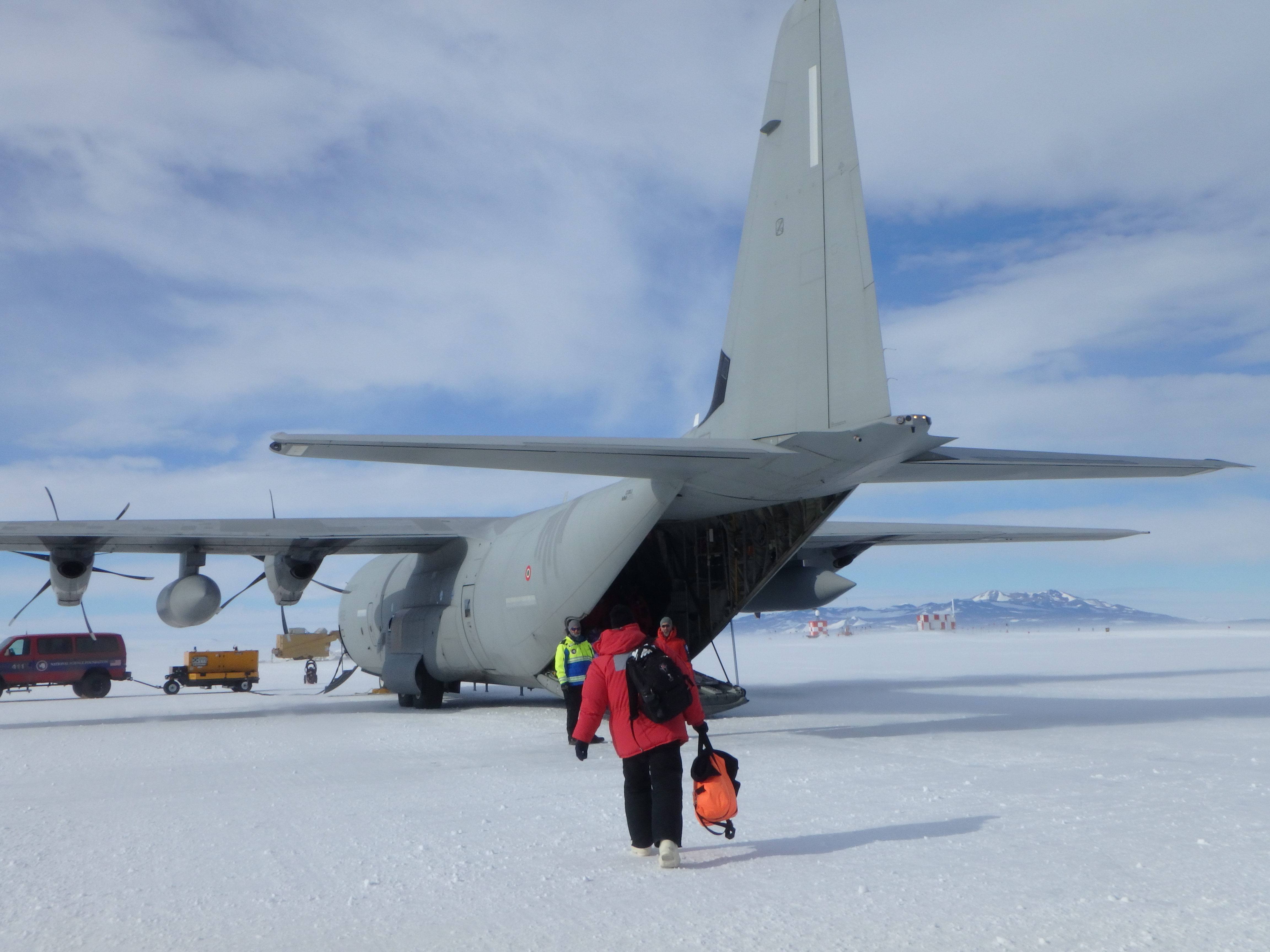 Leaving Antarctica by airplane. The Italian Air Force flew the team from Phoenix Air Field, near McMurdo Station, Antarctica to Christchurch, New Zealand.