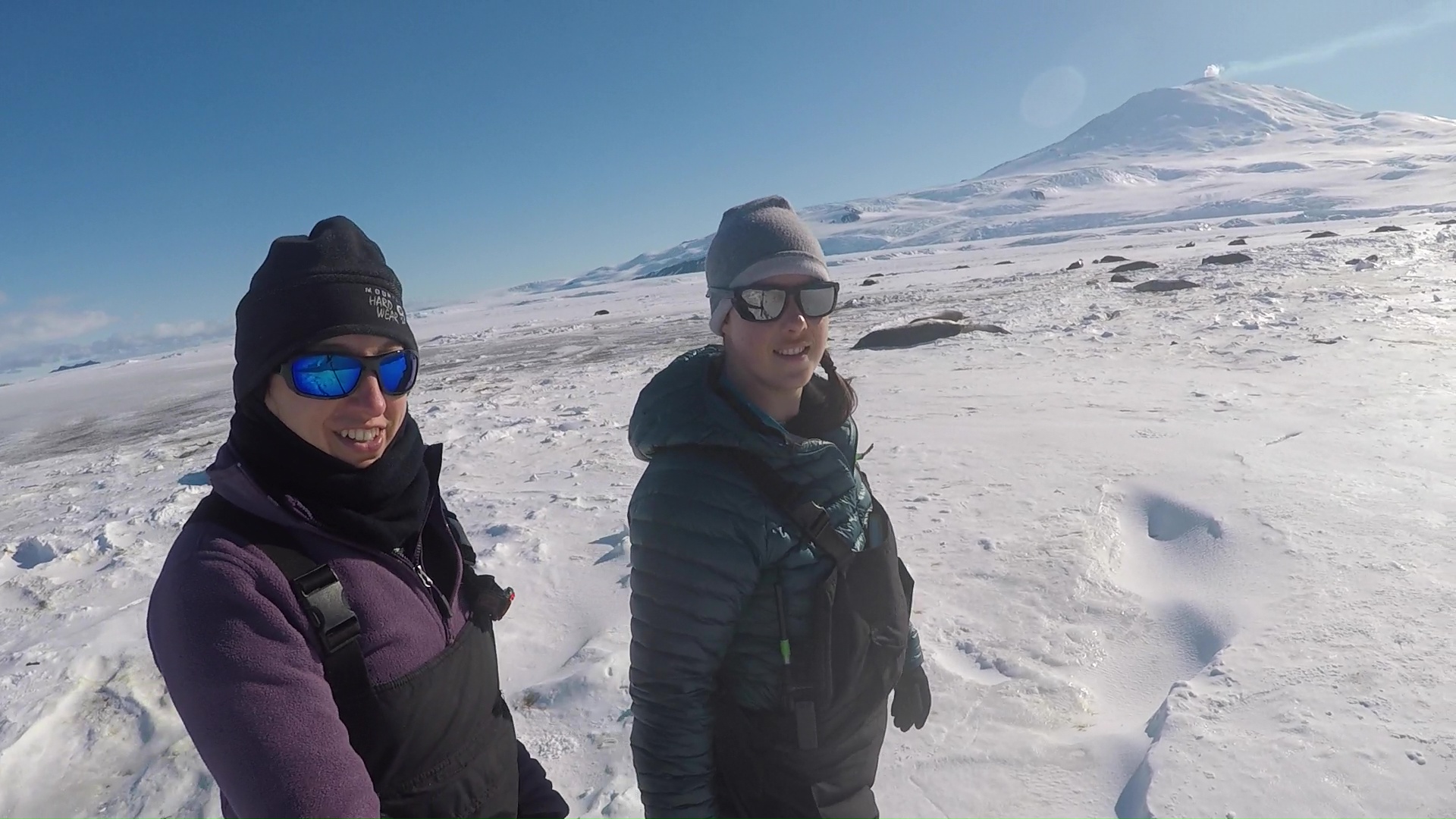 Bridget Ward and Emily Whitmer walk at Hutton Cliffs. The 12,448 foot tall Mount Erebus volcano is in the background. McMurdo Station, Antarctica.