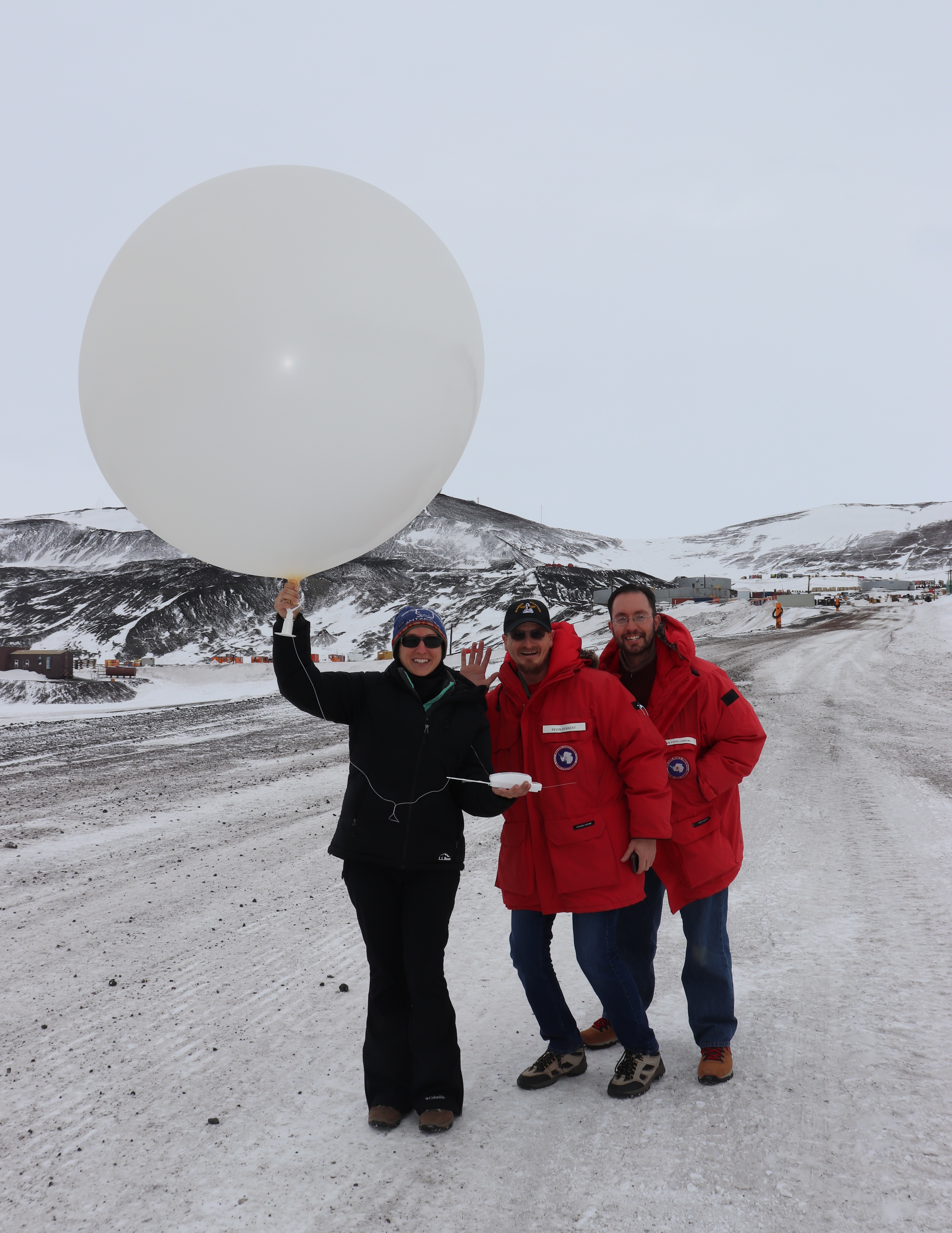 Bridget Ward holds a weather balloon before it is released at McMurdo Station, Antarctica.