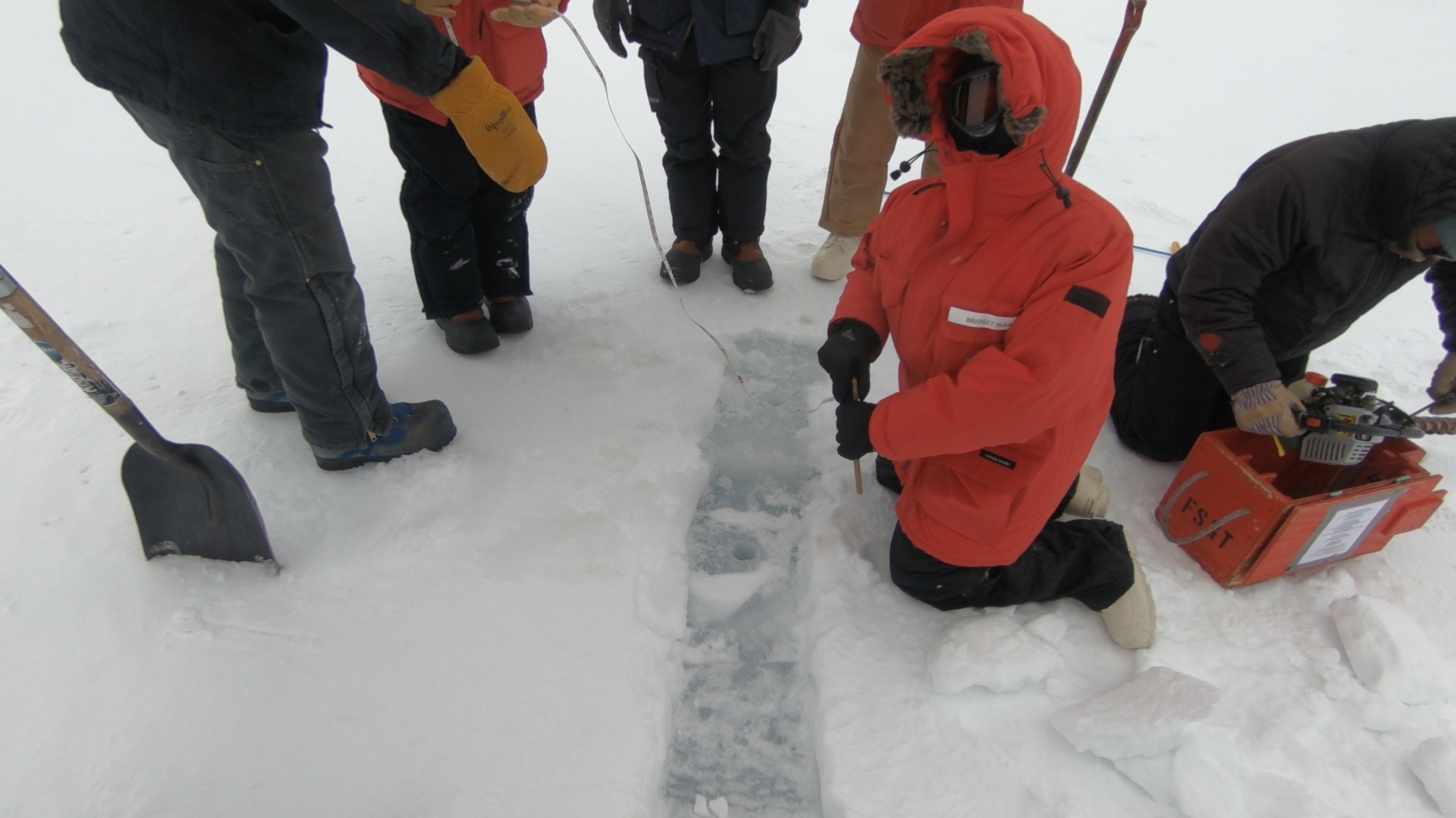 Bridget Ward tests the ice thickness at a site near McMurdo Station, Antarctica.