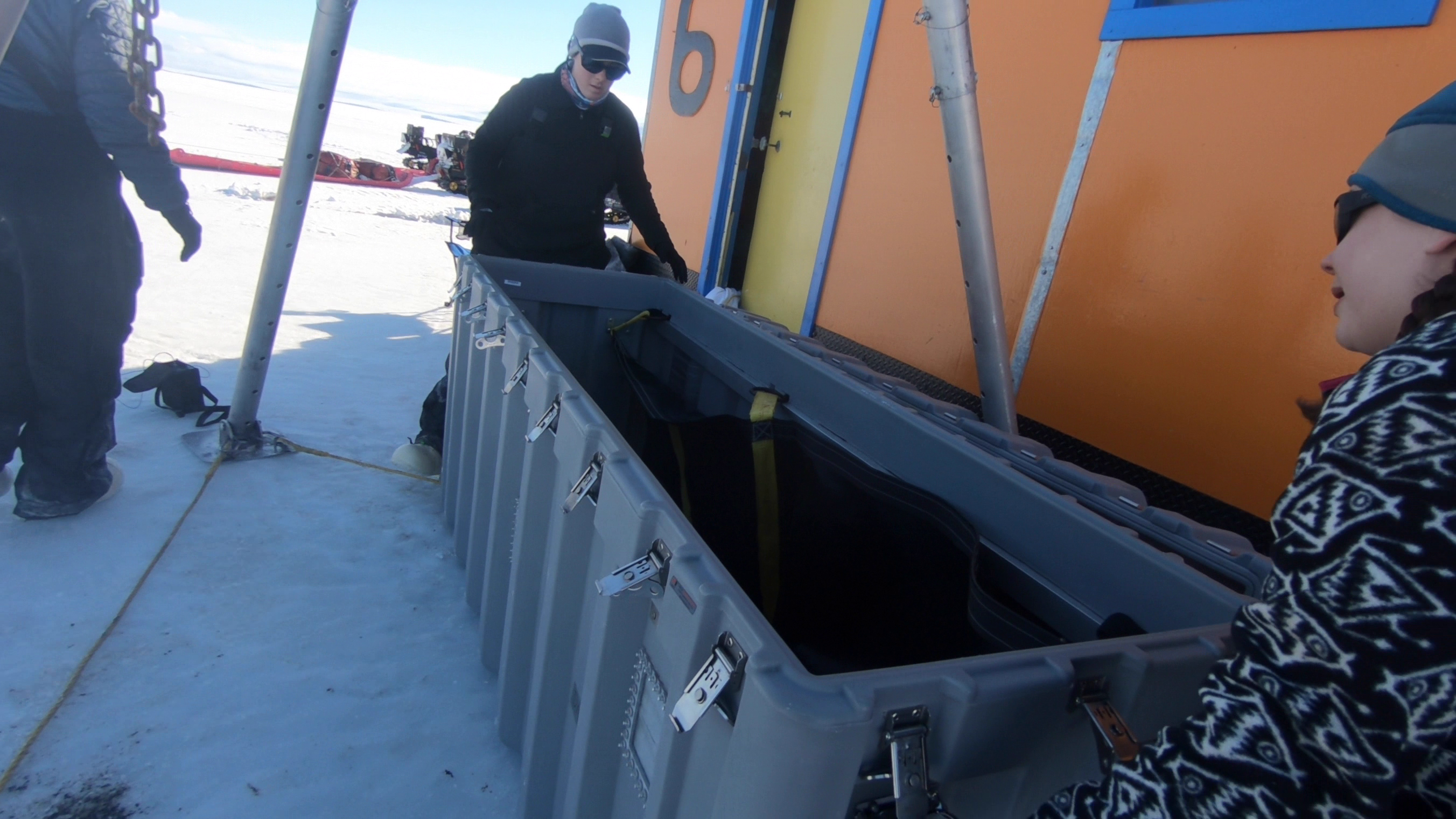 Emily Whitmer and Emma Weitzner work with the team's metabolic chamber. McMurdo Station, Antarctica.