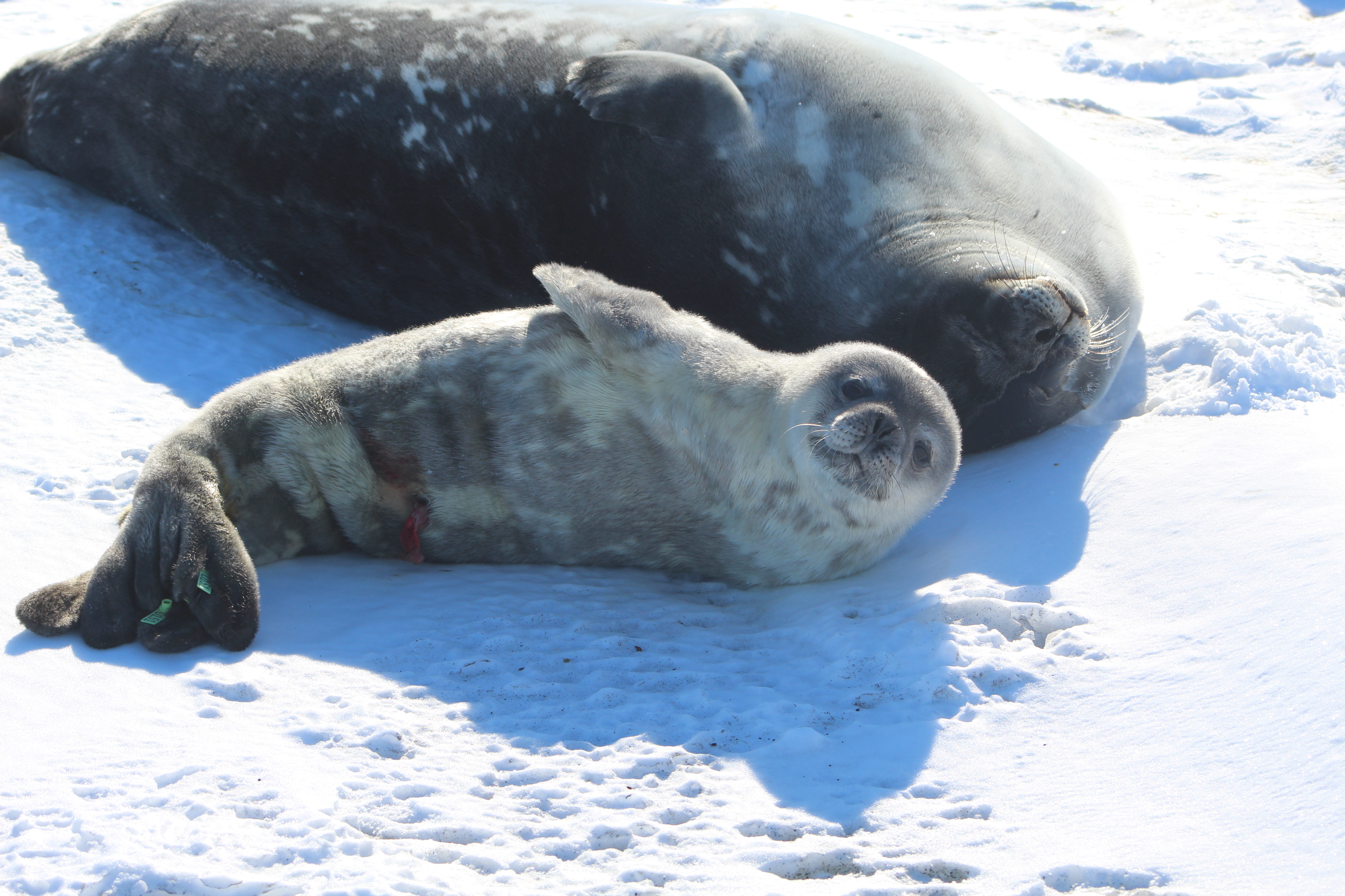 A fluffy Weddell seal pup lays on the sea ice next to its mother. Turtle Rock, Antarctica.
