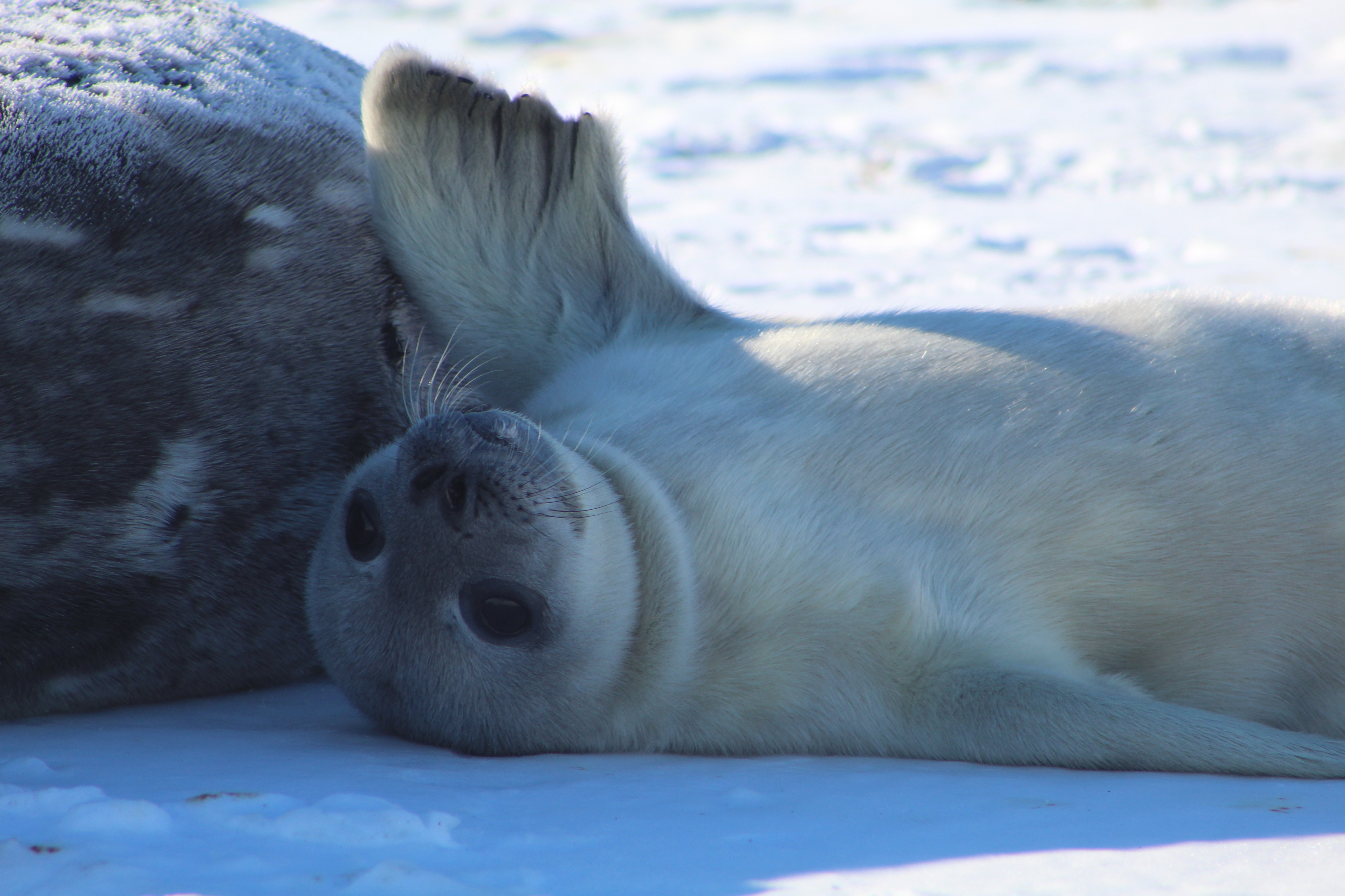 A fluffy Weddell seal pup lays on the sea ice next to its mother and gives a wave. Hutton Cliffs, Antarctica.