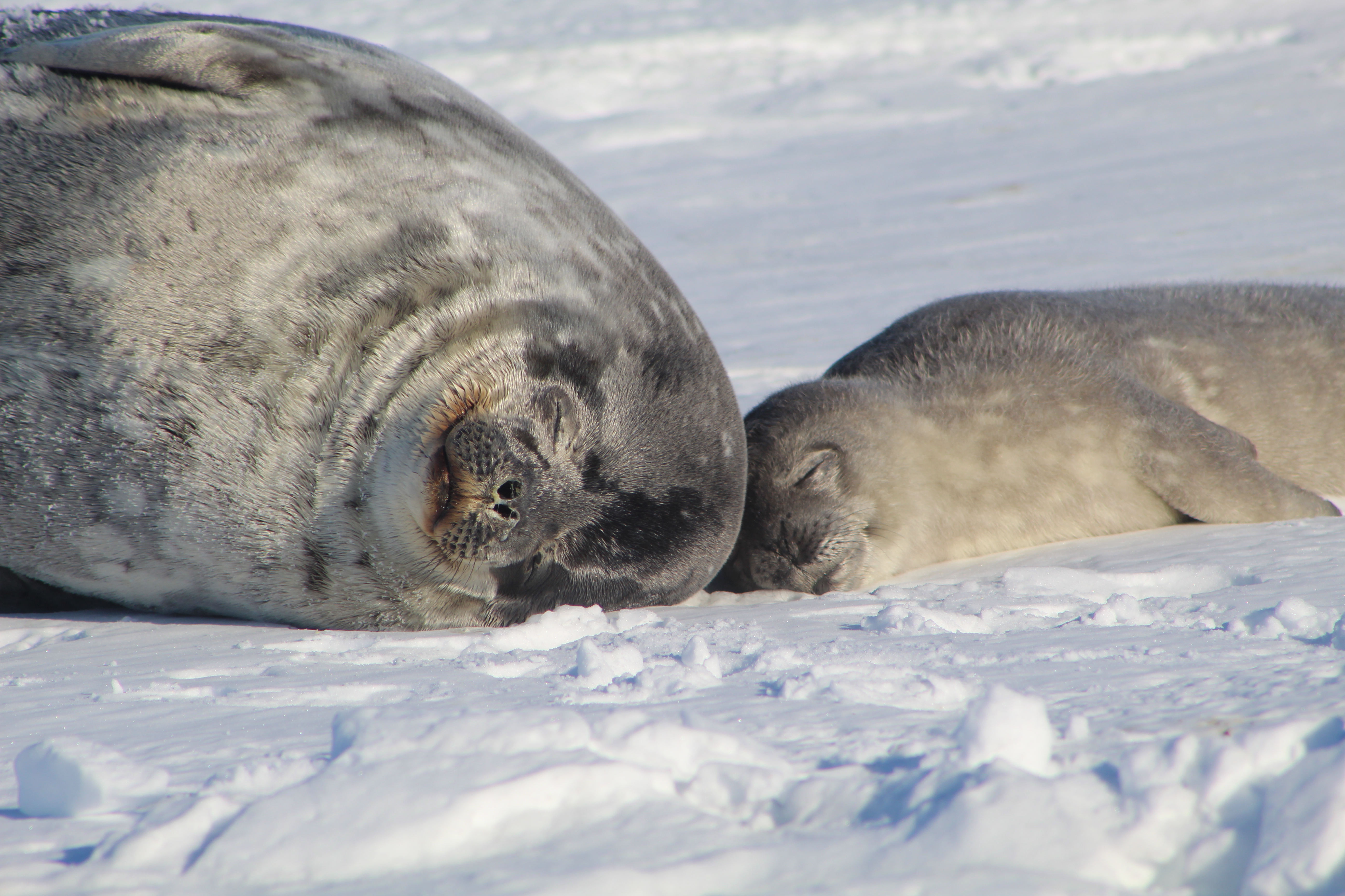 A mother Weddell seal takes a nap with her pup. Turtle Rock, Antarctica.