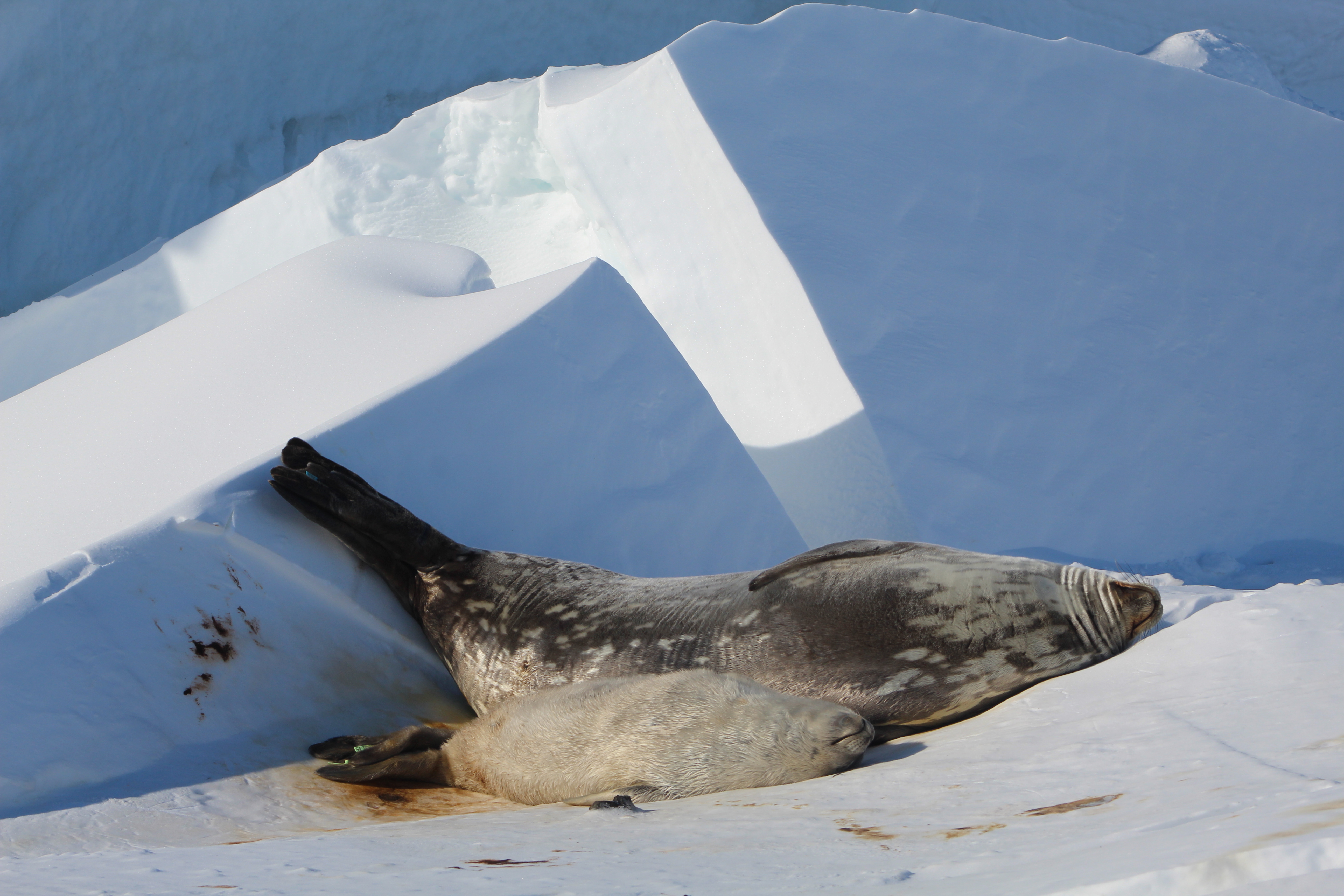 A mother Weddell seal takes a nap with her pup out in the sun. Hutton Cliffs, Antarctica.