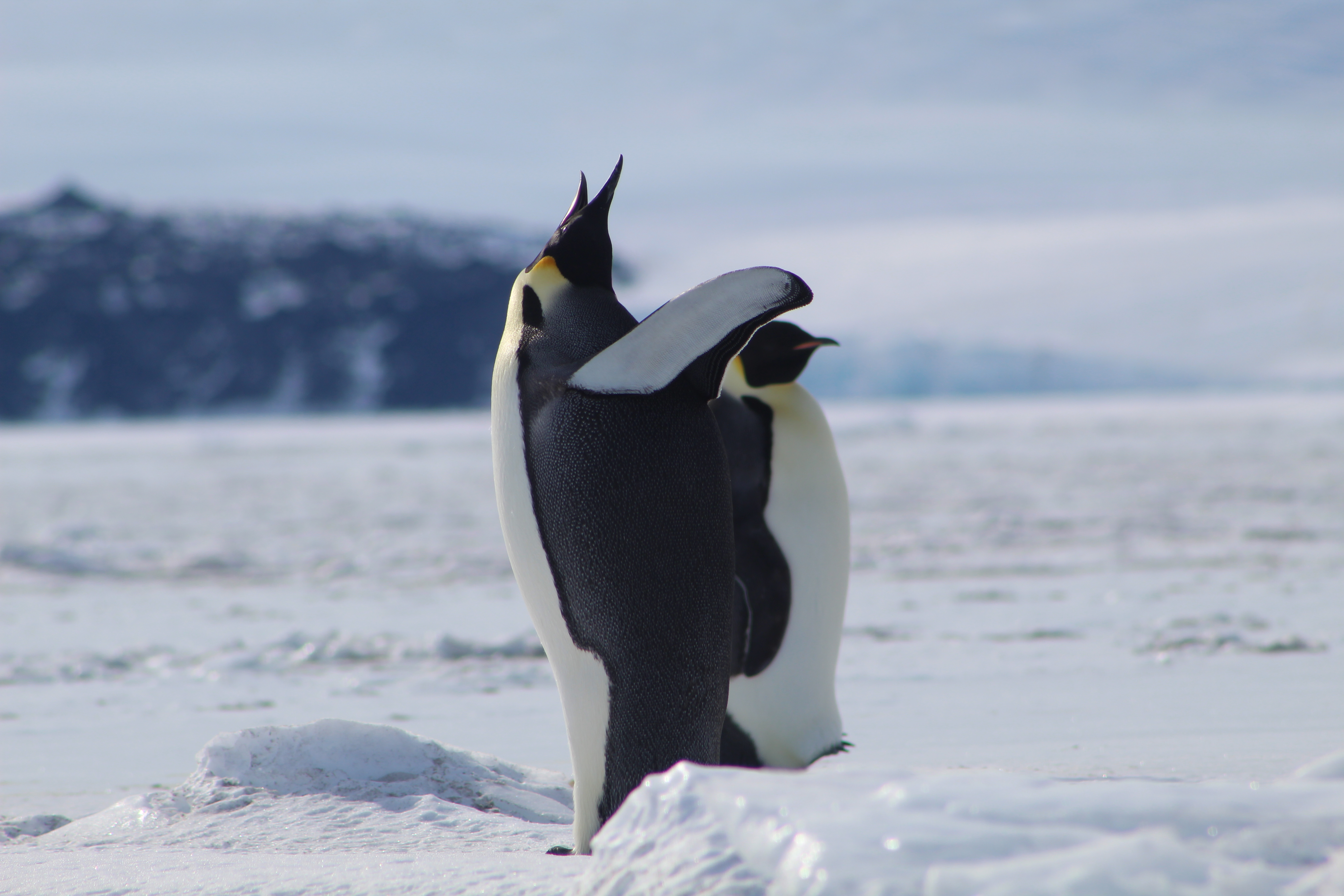 An Emperor penguin flapping its wings and looking up at the sky. Big Razorback, Antarctica.