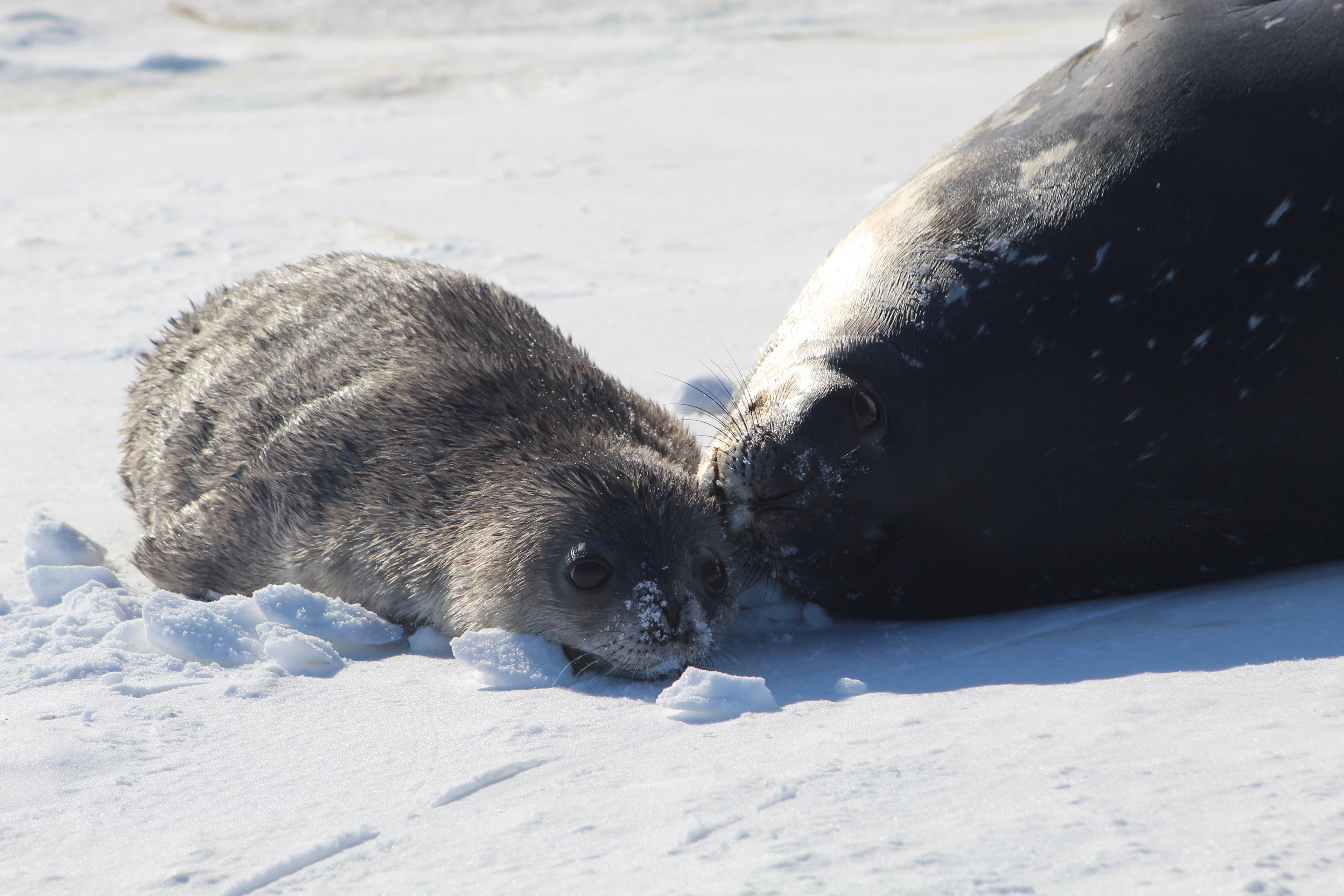 A wet Weddell seal pup and its mother rest on the ice after a swimming lesson. Hutton Cliffs, Antarctica.