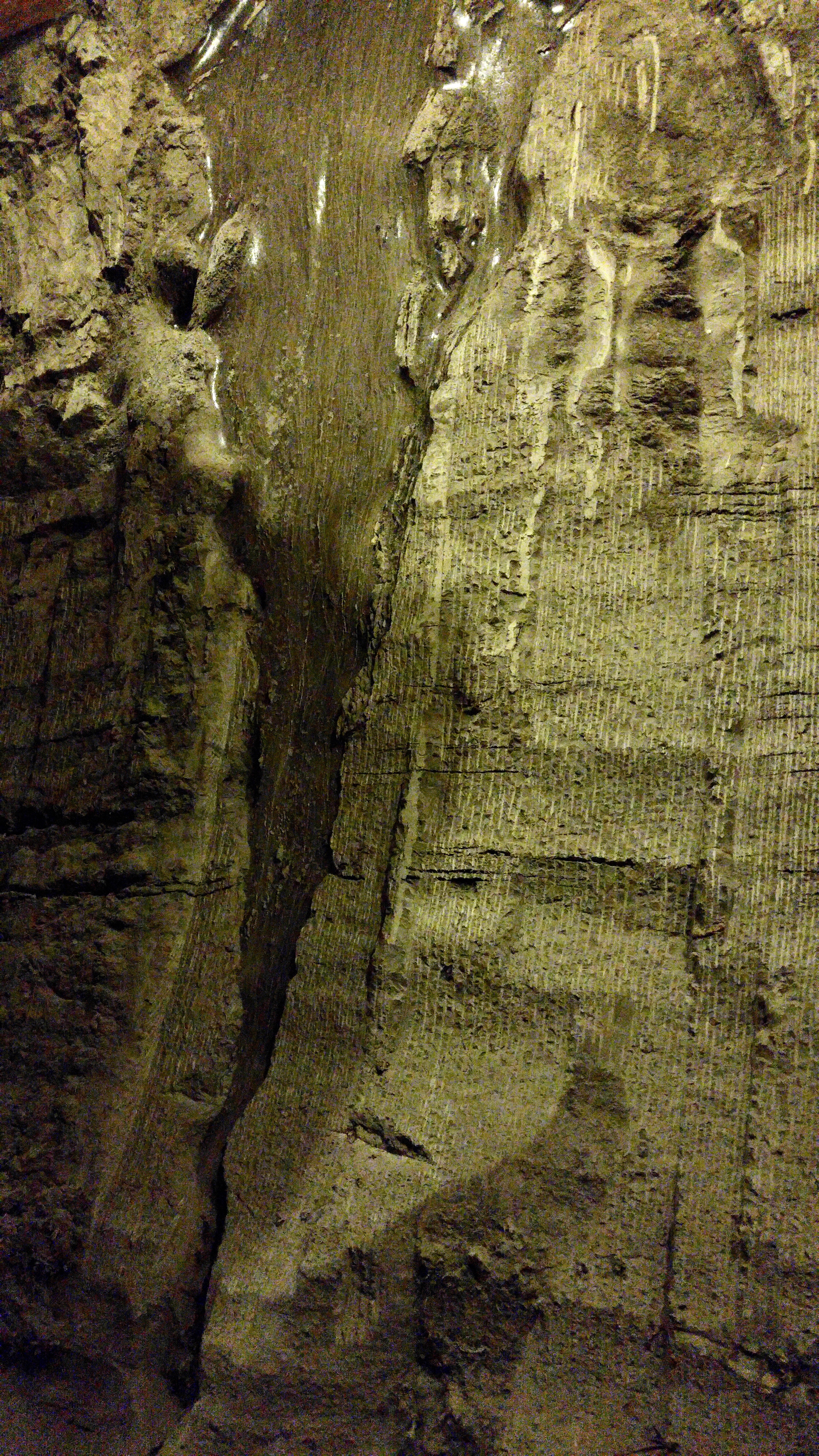 Ice wedges, common formations within permafrost, are visible in the Permafrost Tunnel. CRREL Permafrost Tunnel, Fox, Alaska.