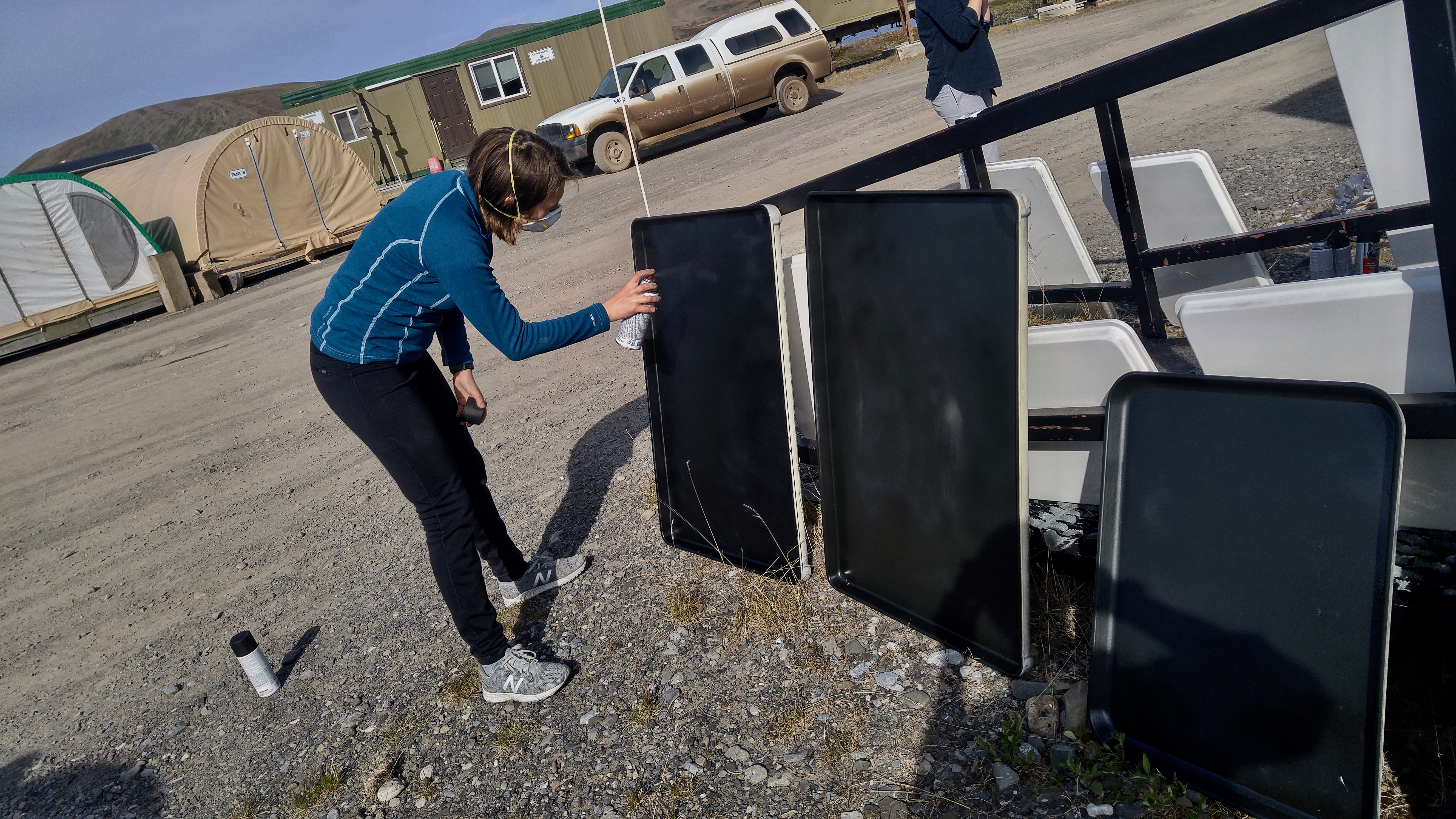 Research technician Emma Daily spray-paints sample trays that will be used for exposing samples to sunlight. Toolik Field Station, Alaska.