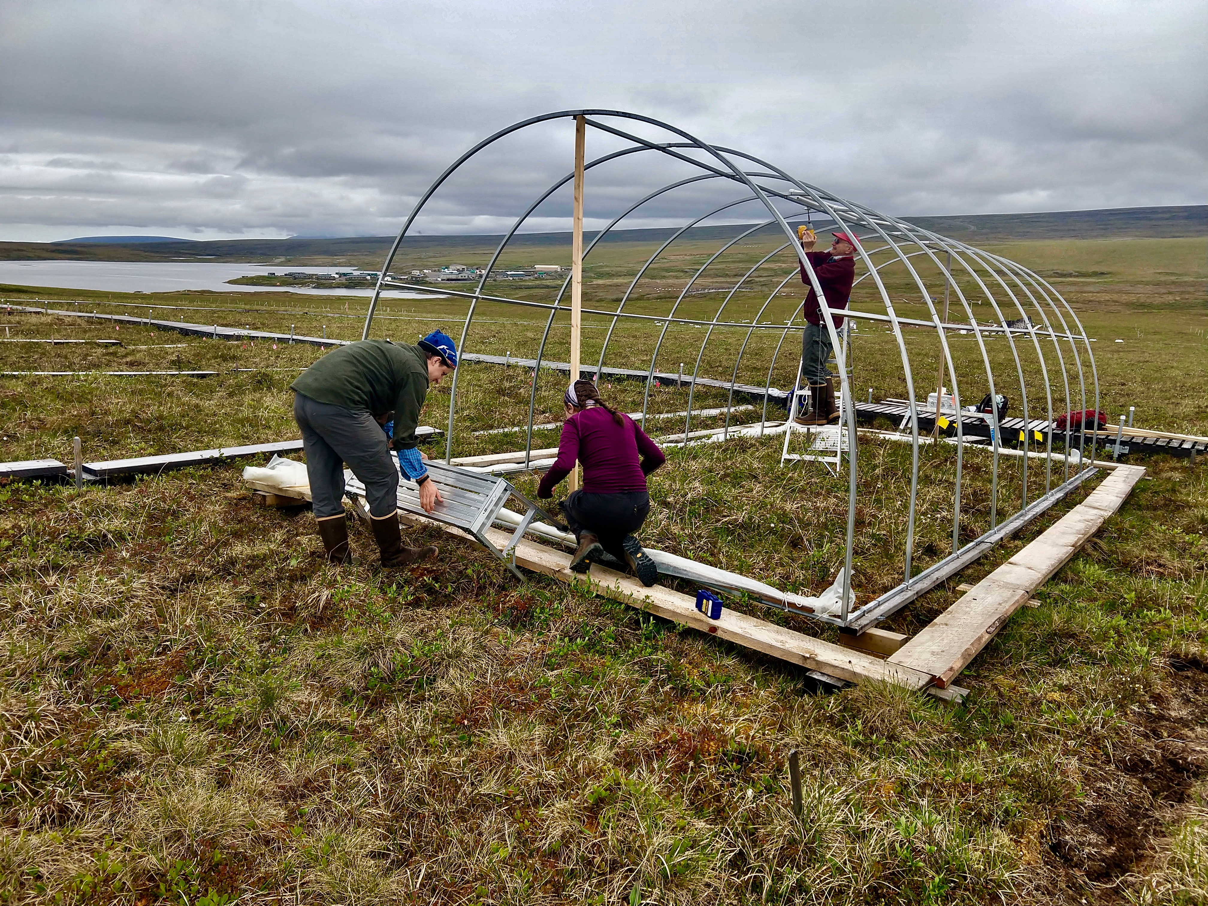 Graduate student Nicole Williamson, senior technician Jim Laundre, and PolarTREC teacher David Walker build a greenhouse at Toolik Field Station, Alaska.