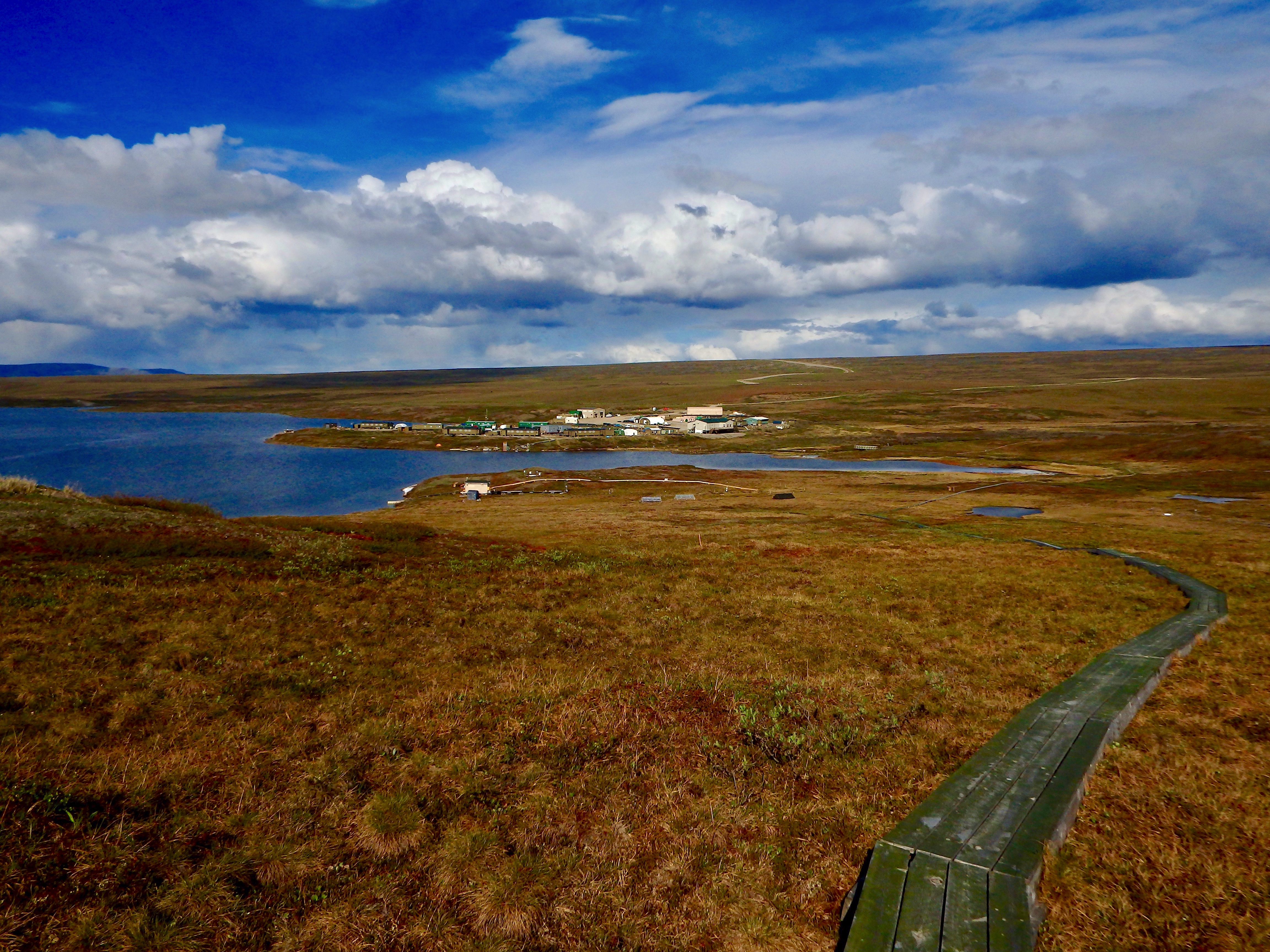 Toolik Field Station, Alaska sits on Toolik Lake, downslope from the terrestrial research boardwalks south of the station.
