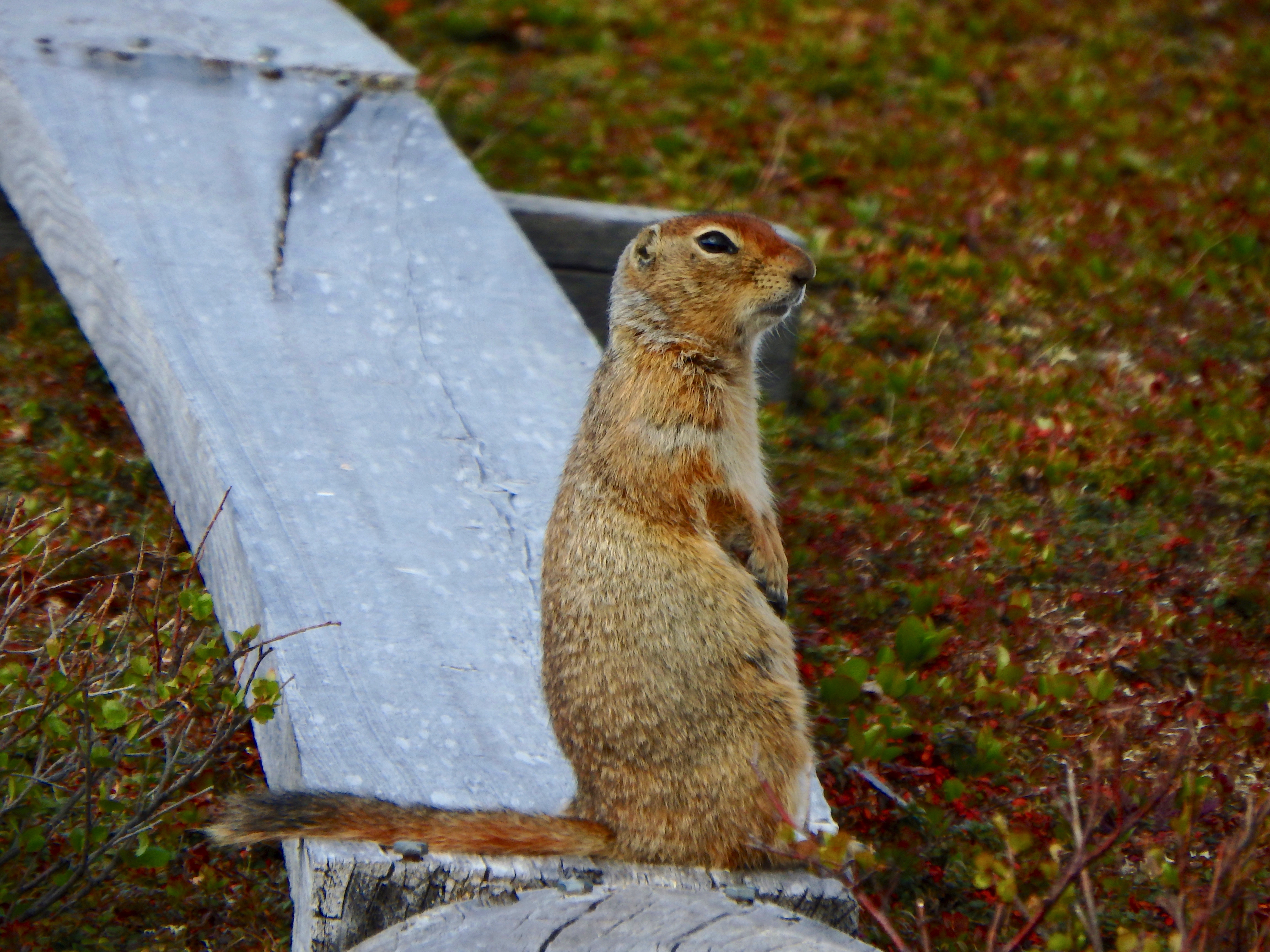 An Arctic ground squirrel perches on a boardwalk at Toolik Field Station, Alaska.