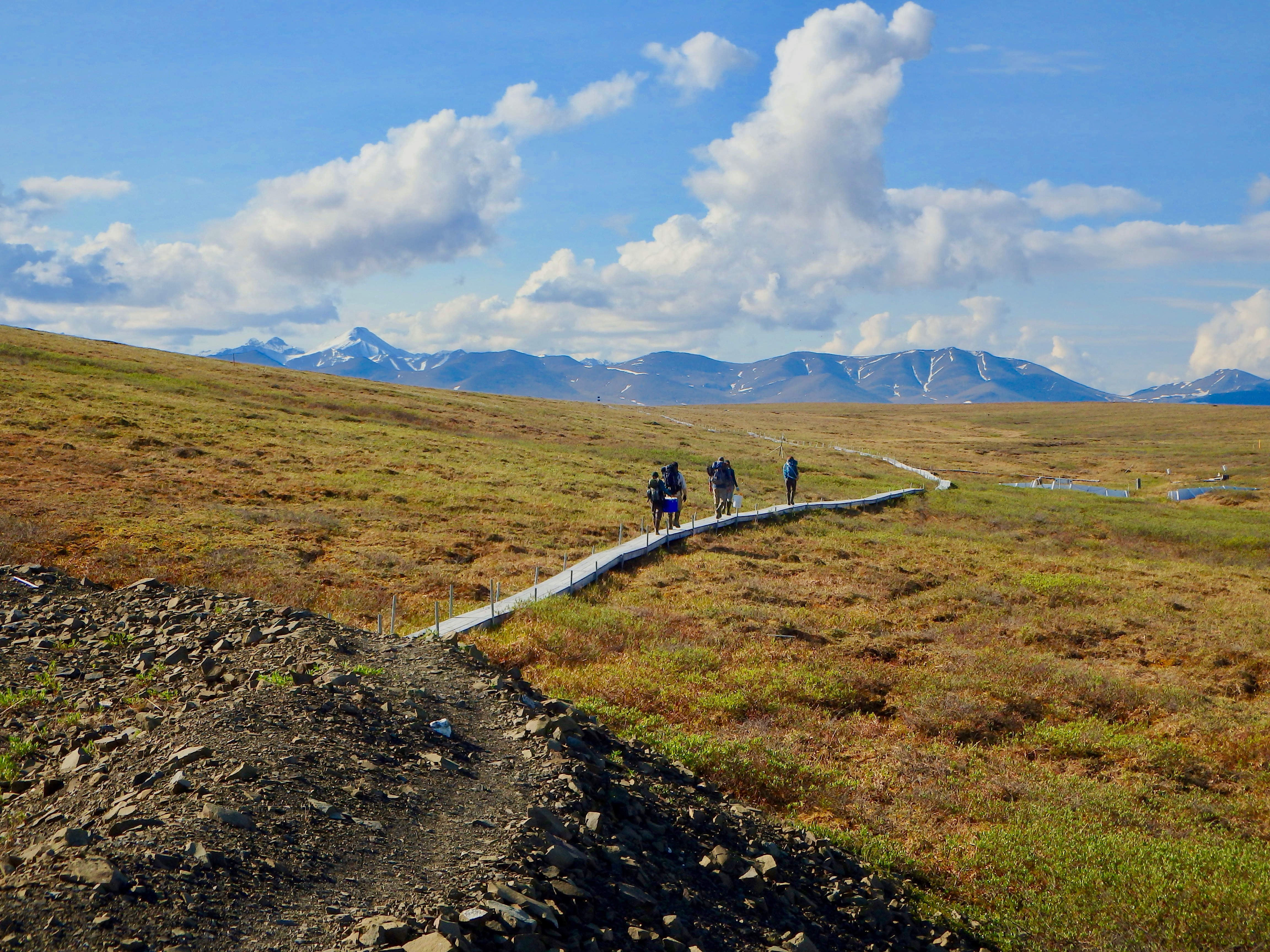 The research group walks to the study site on the wet sedge tundra in the early morning. Imnavait Creek, North Slope, Alaska.