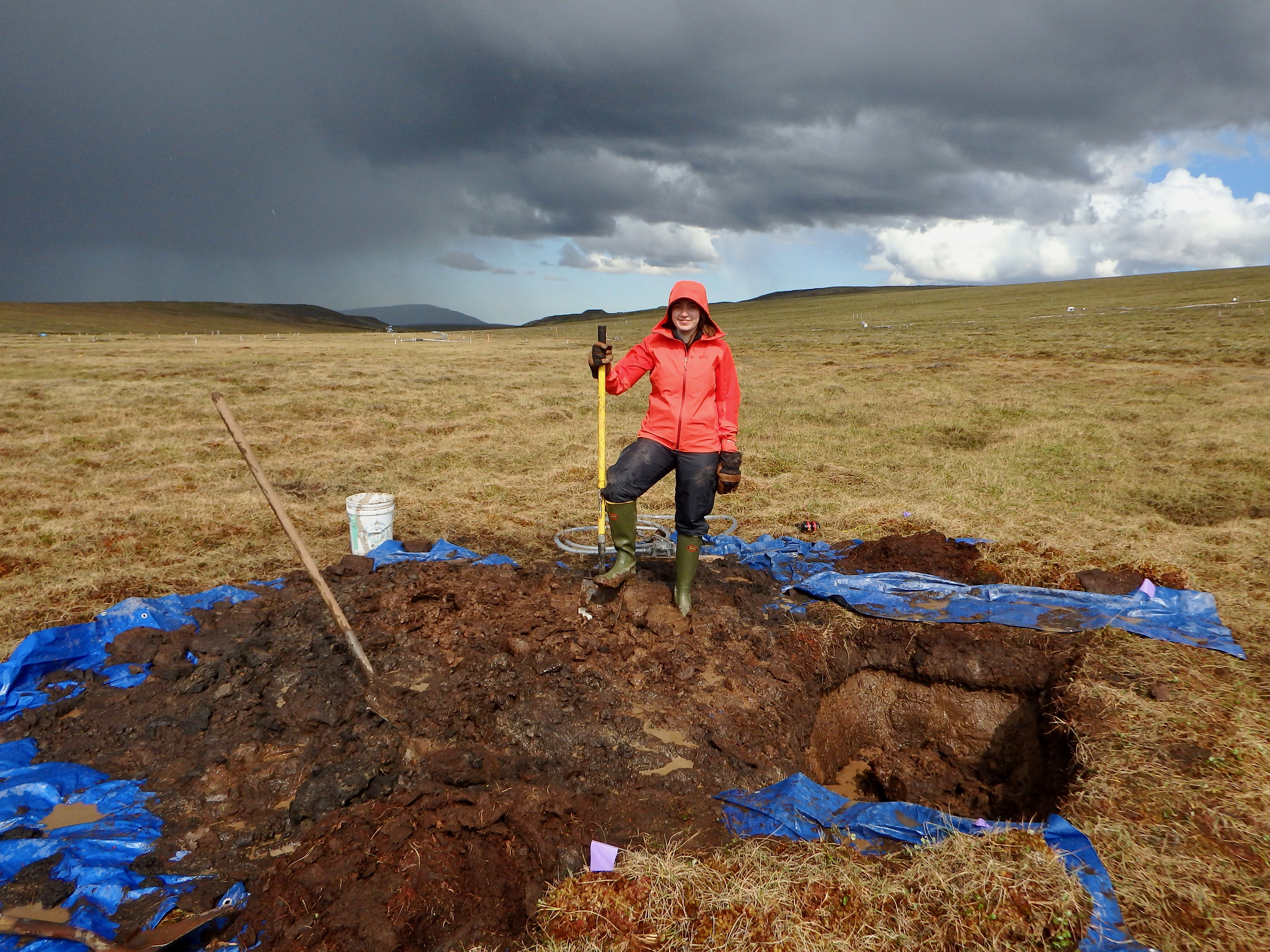 Research technician Katie Polik stands next to a completed soil pit on the wet sedge tundra. Imnavait Creek, North Slope, Alaska.