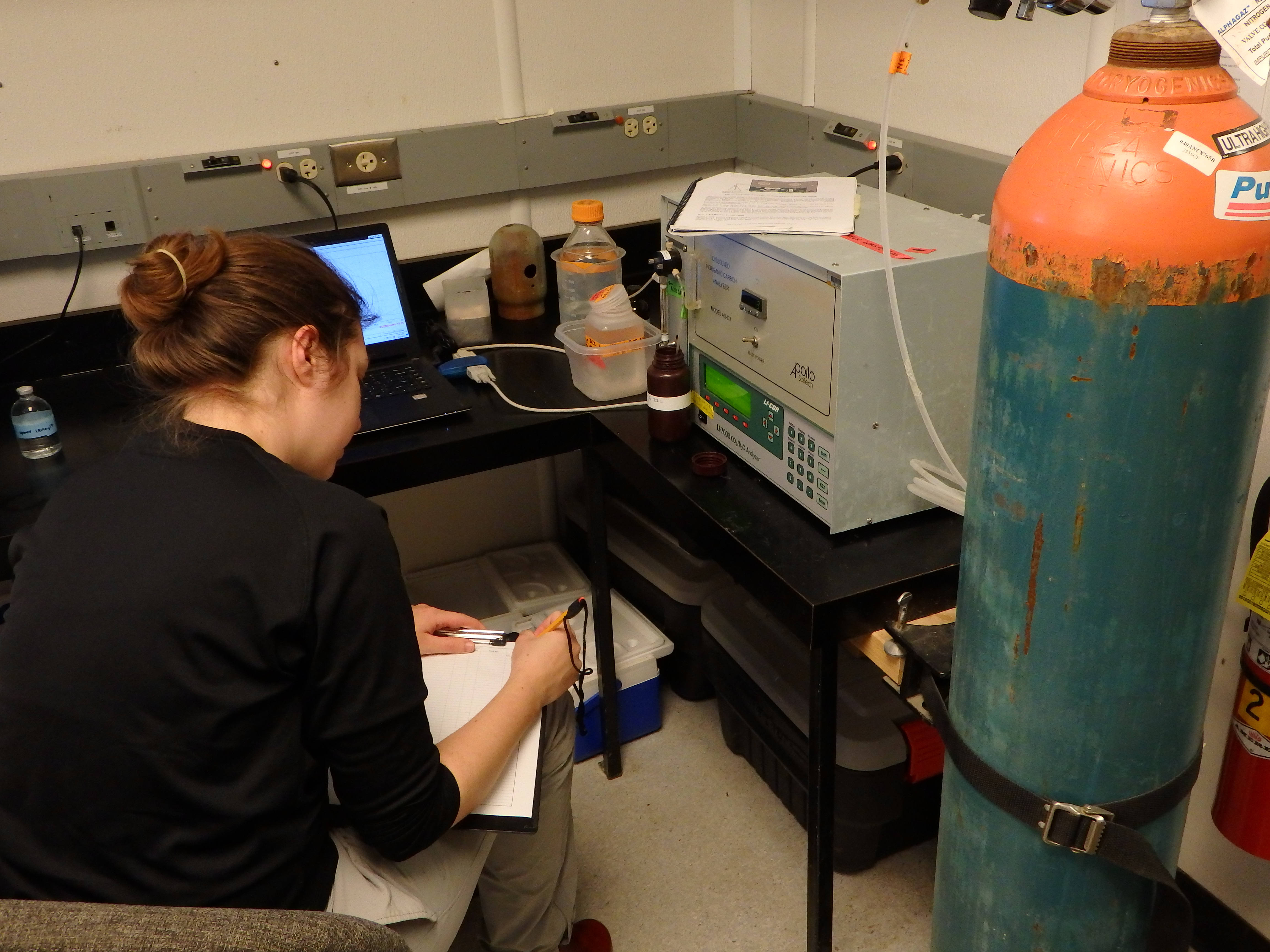 Research technician Katie Polik tests a sample for dissolved carbon dioxide. Toolik Field Station, Alaska.