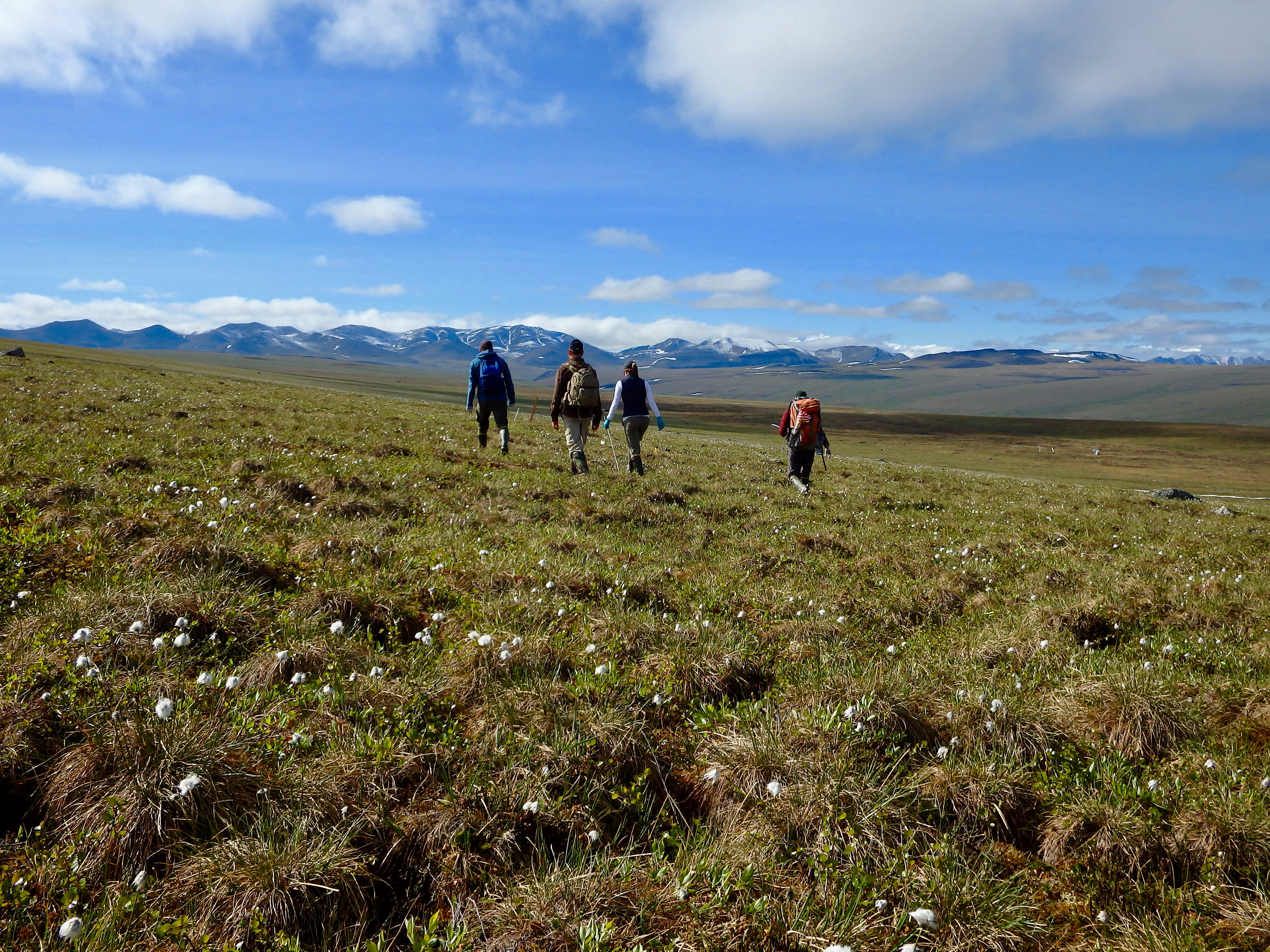 Jason Dobkowski, Dr. George Kling, Satya Kent, and Em Daily (left to right) walk to a study site near Imnavait Creek to take thaw depth measurements. North Slope, Alaska.