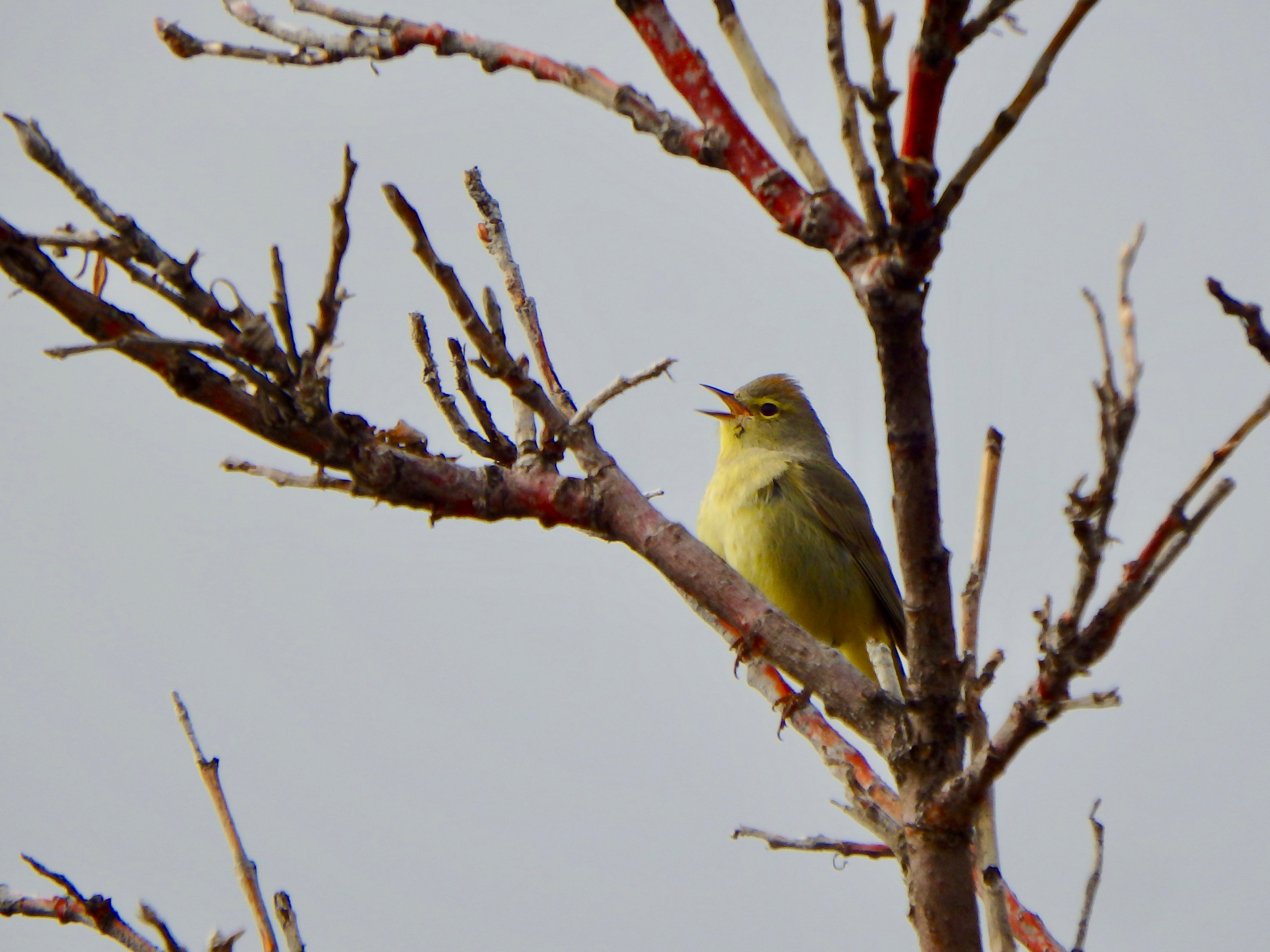 An orange-crowned warbler vocalizes in the bushes near Galbraith Lake, Alaska.