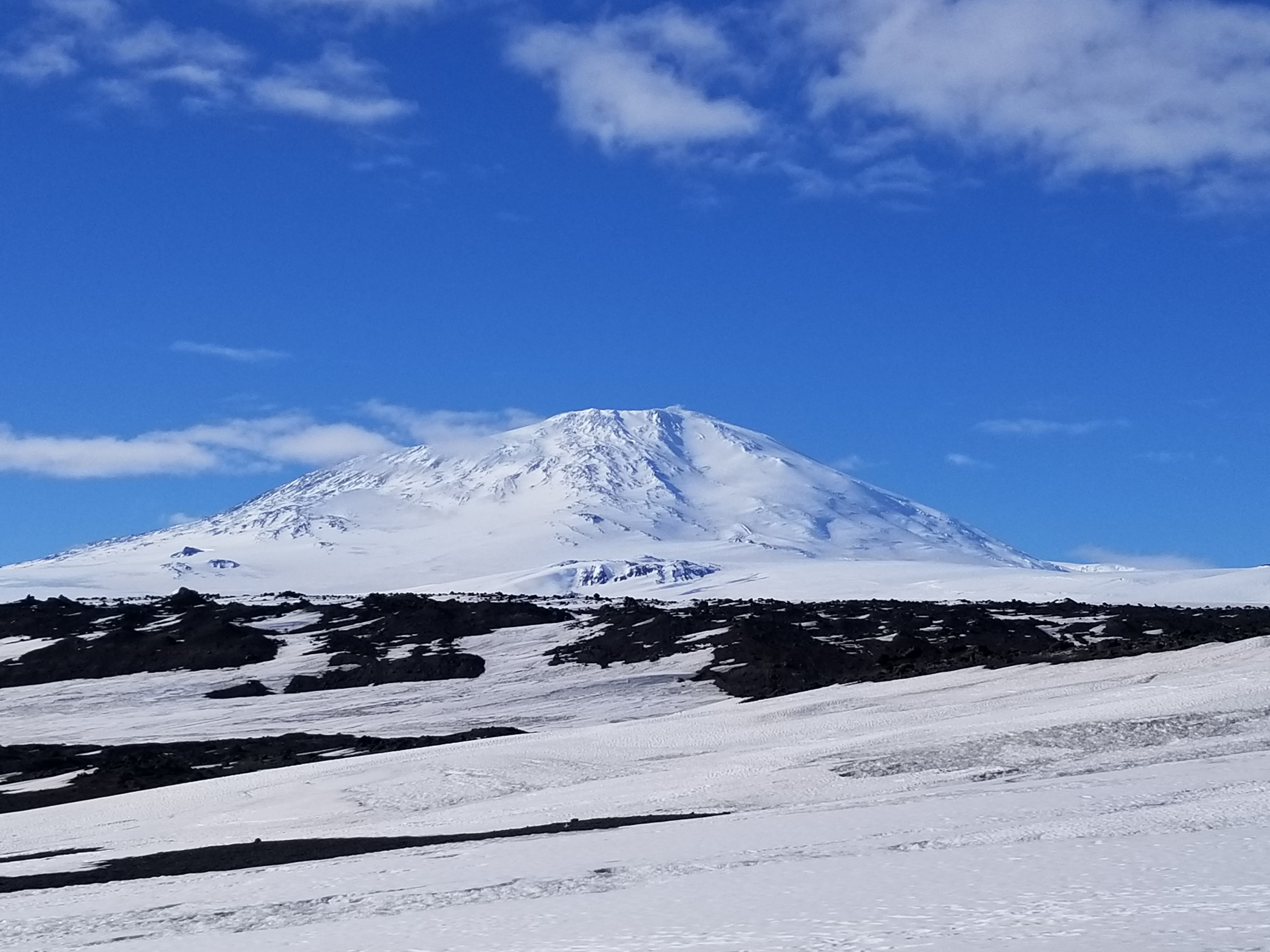 A view of Mount Erebus from Scott's Hut at Cape Evans, Antarctica.