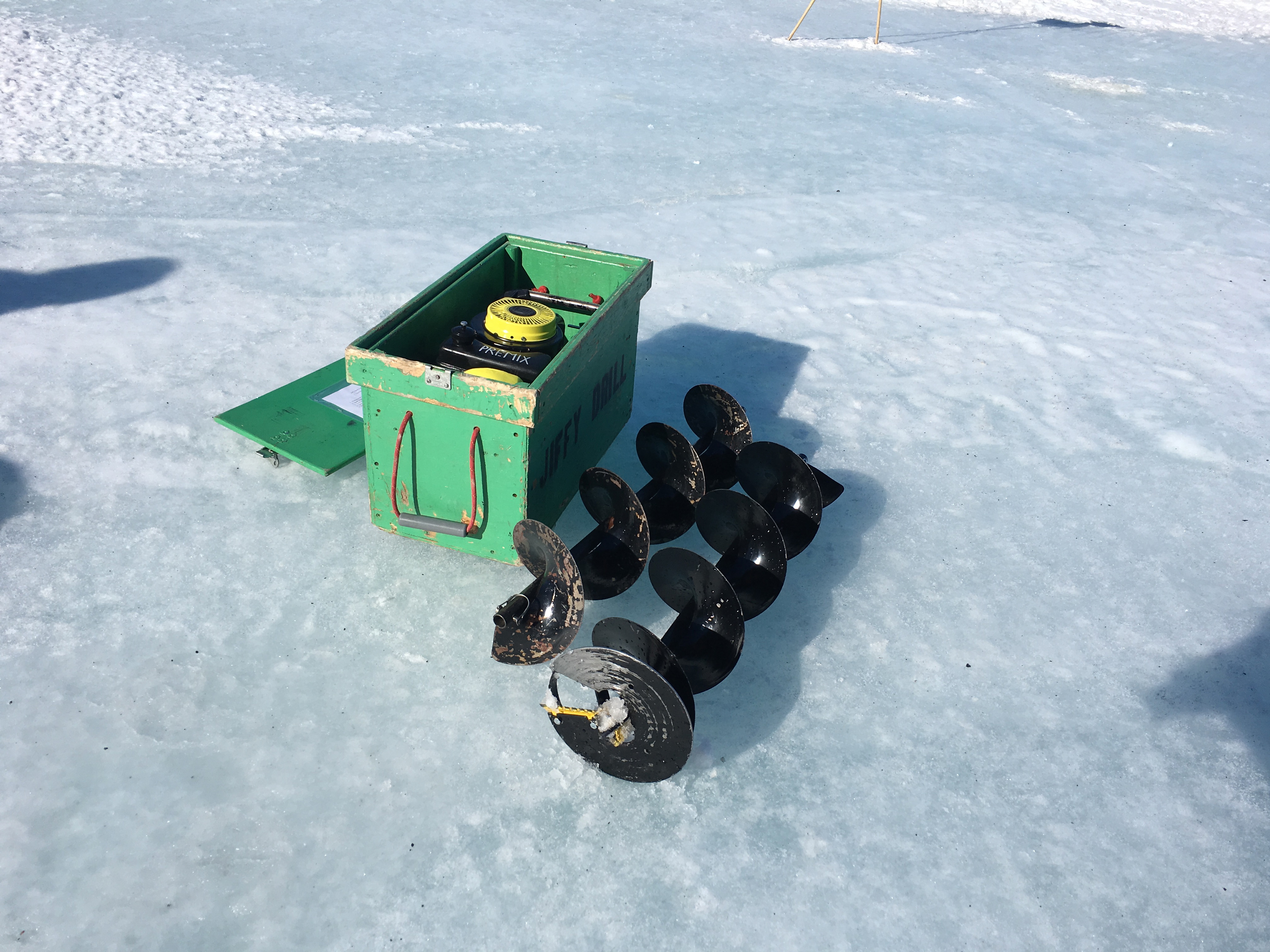 The parts of the Jiffy drill are unpacked on the sea ice of McMurdo Sound, near McMurdo Station, Antarctica.