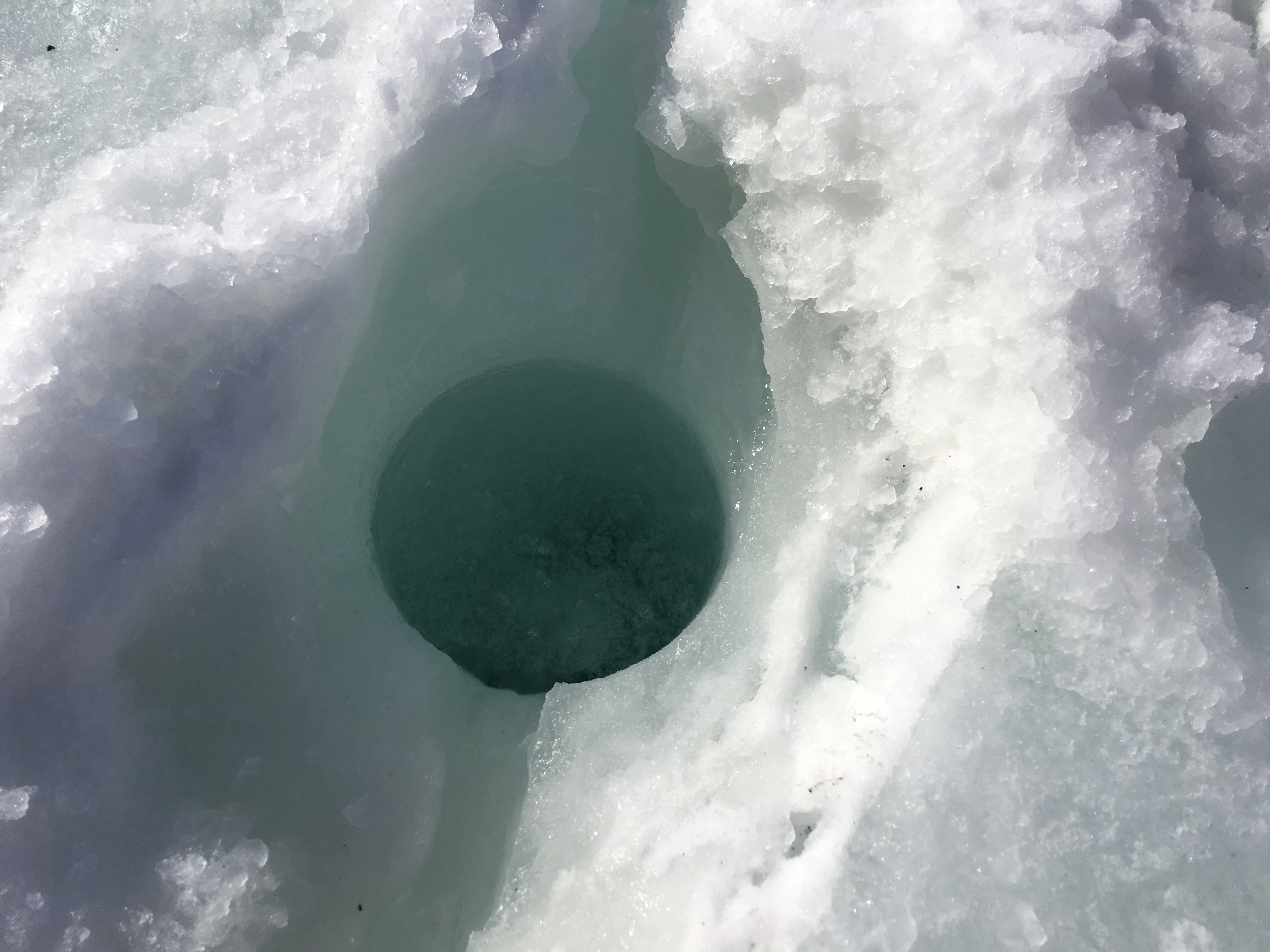 A hole made in the sea ice with the Jiffy drill. The hole will be used for ice fishing. McMurdo Station, Antarctica.