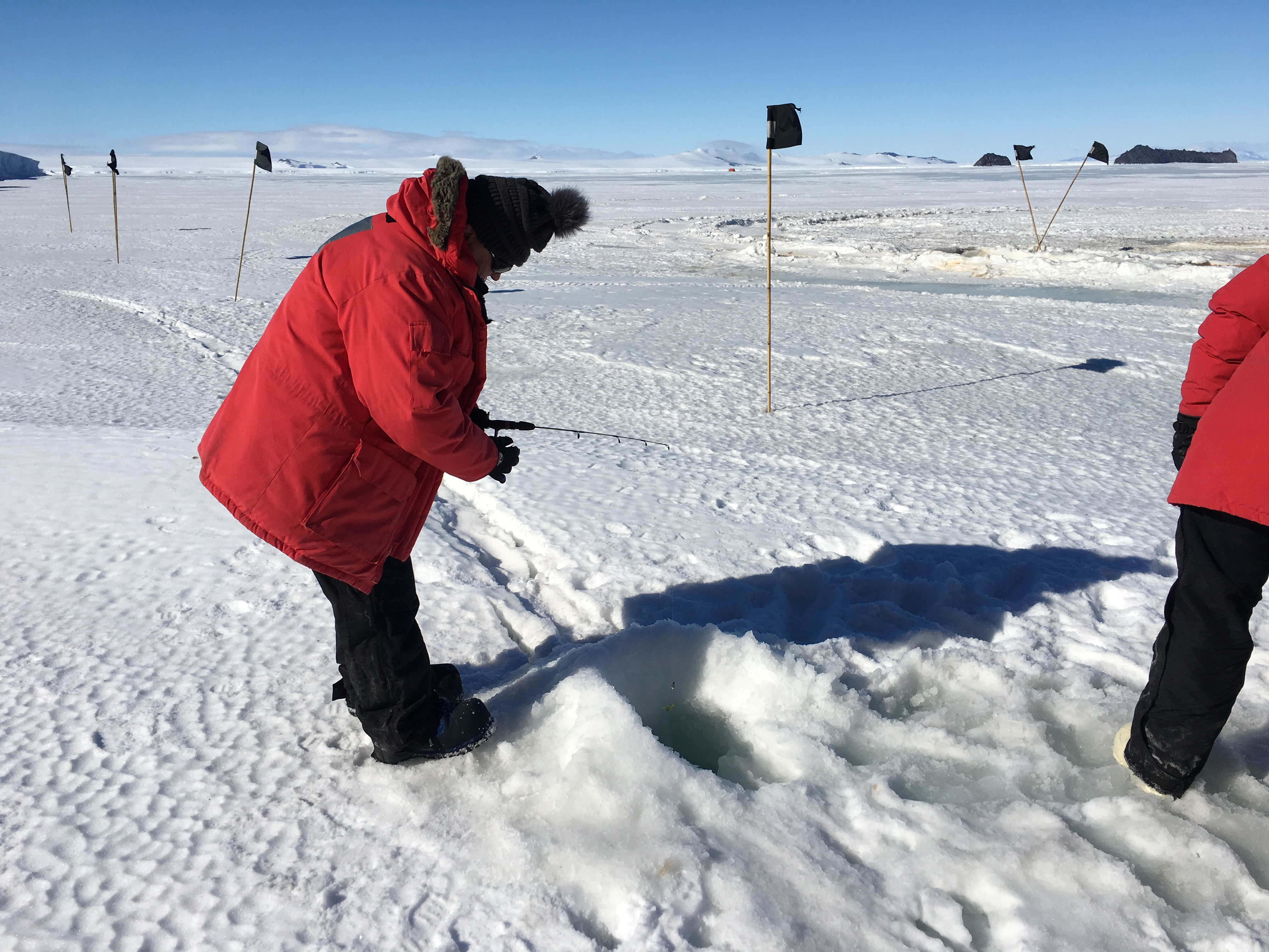 Denise Hardoy does some ice fishing through the hole drilled in the sea ice. The fish are being collected for research purposes. McMurdo Station, Antarctica.