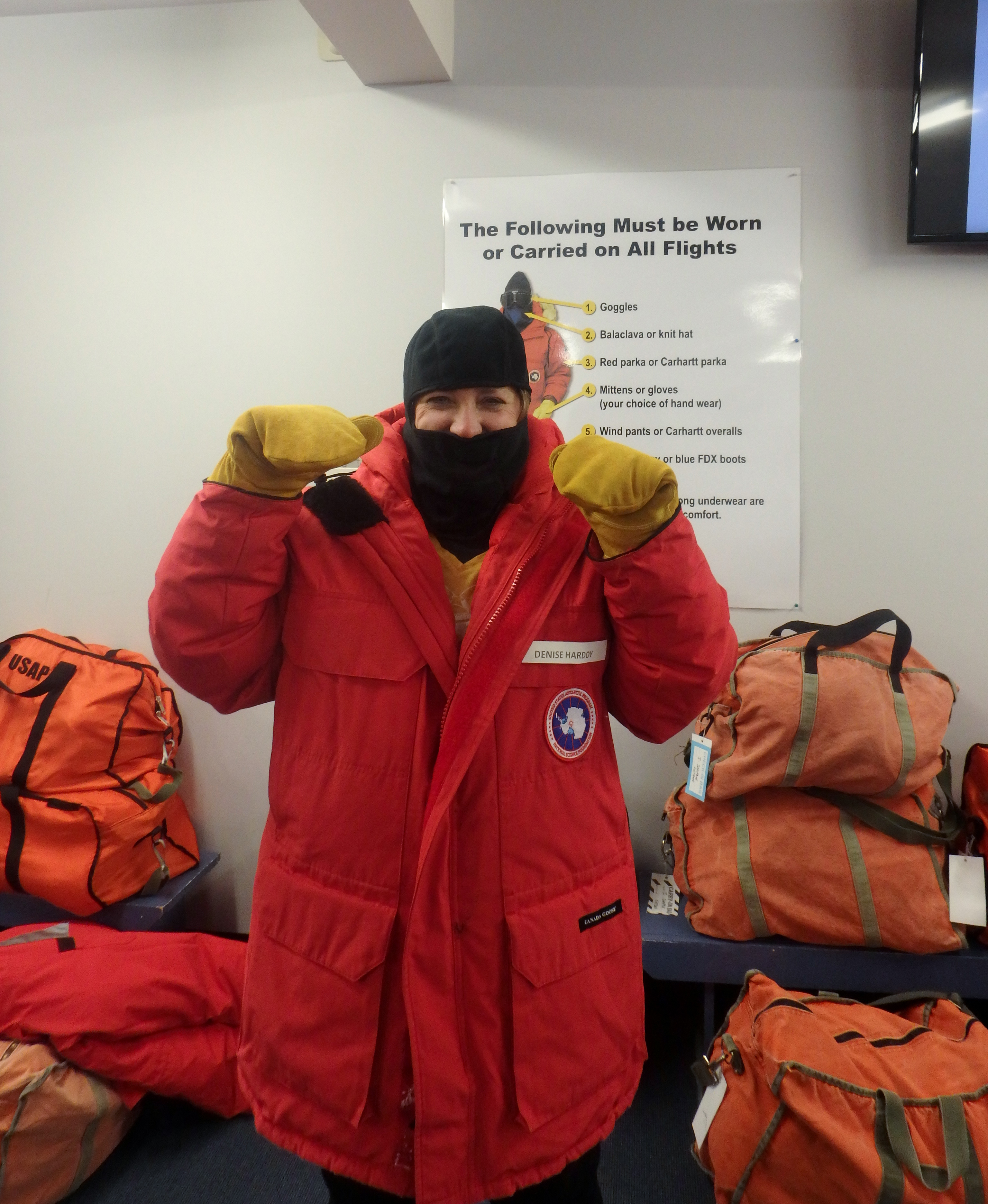 Denise Hardoy tries on her Extreme Cold Weather (ECW) gear at the United States Antarctic Program's Clothing Distribution Center in Christchurch, New Zealand.
