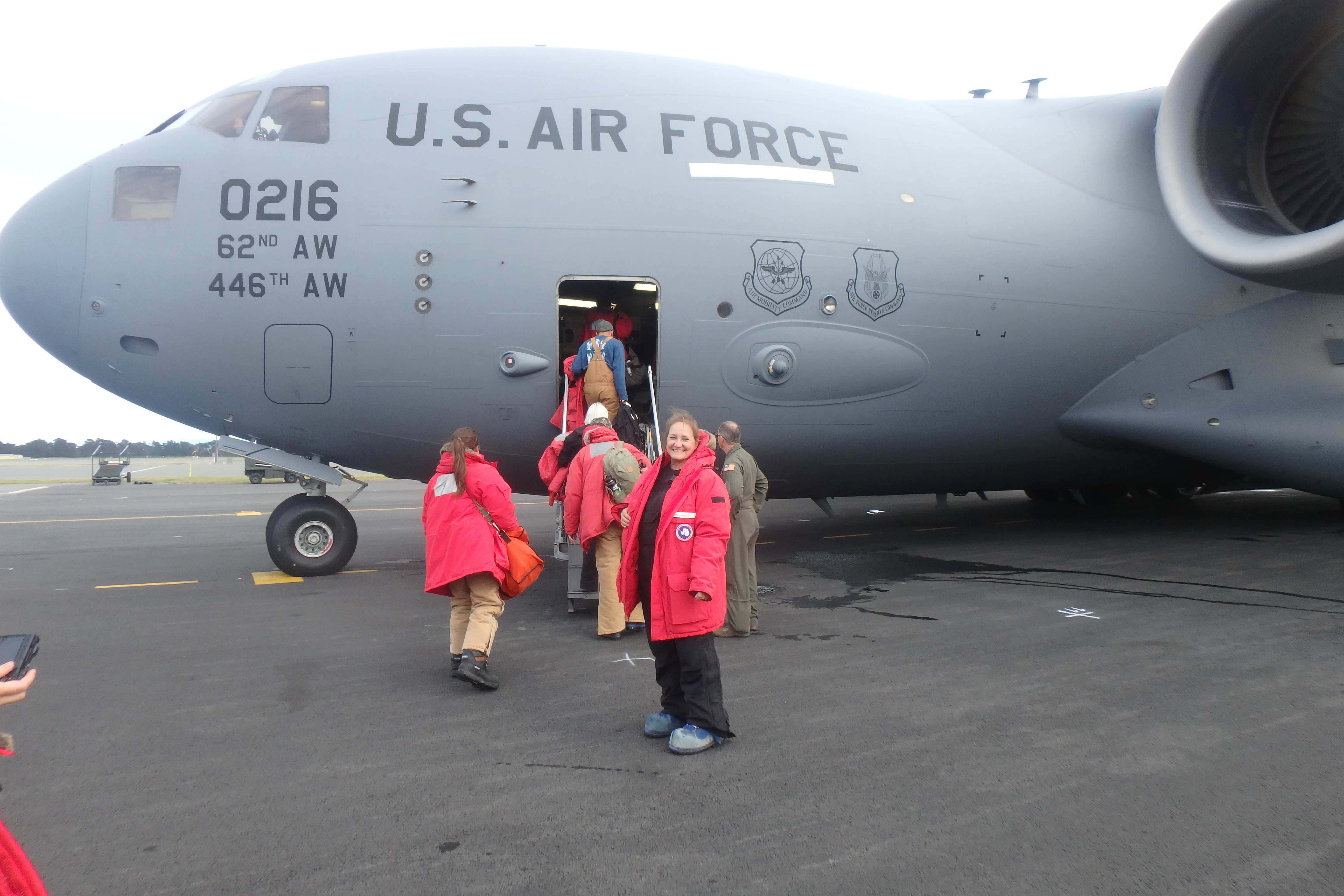 Denise Hardoy and the team board the C-17 that will take them to Antarctica. Christchurch, New Zealand.