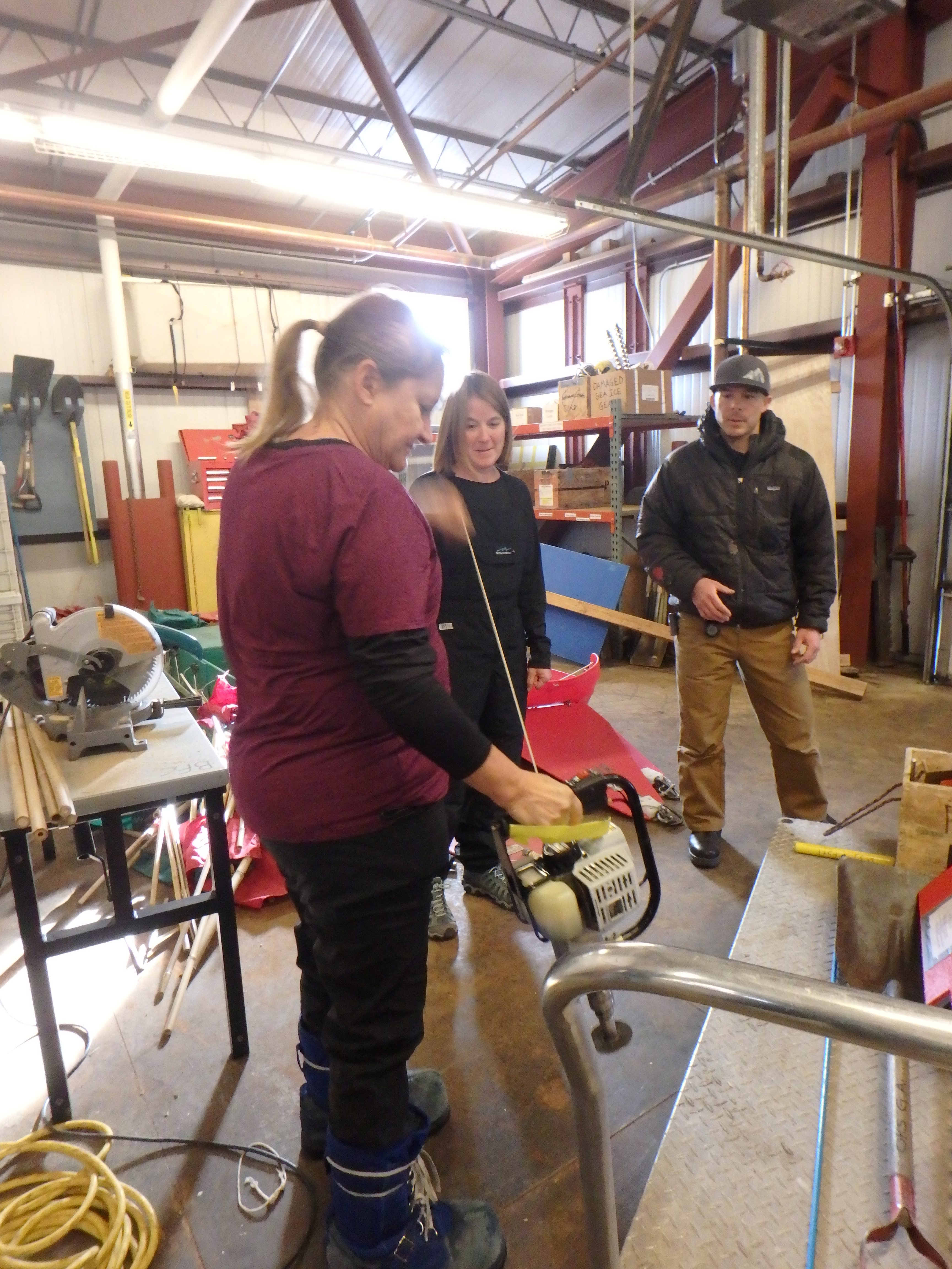 Denise Hardoy practices starting up the ice drill. McMurdo Station, Antarctica.