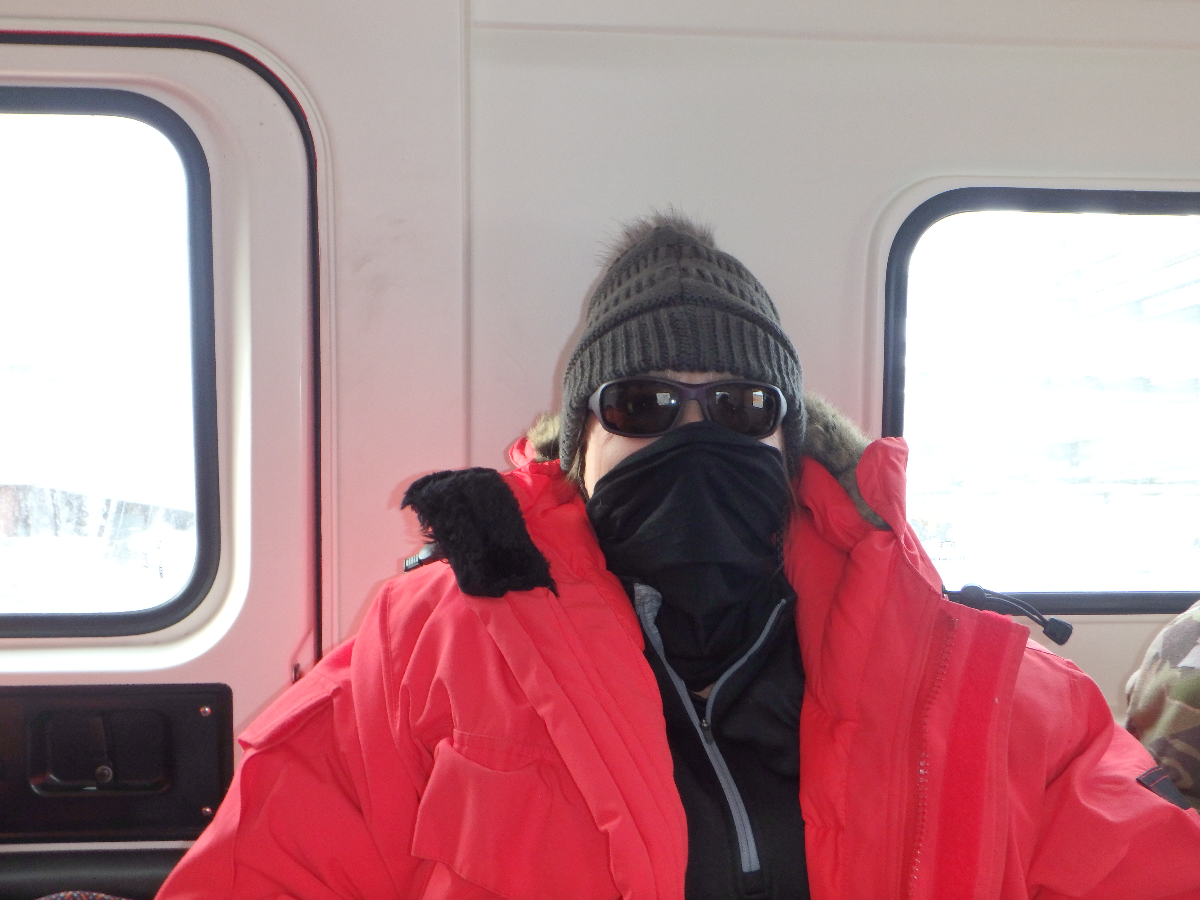 Denise Hardoy rides in the Hägglunds vehicle as it travels across the sea ice. McMurdo Station, Antarctica.