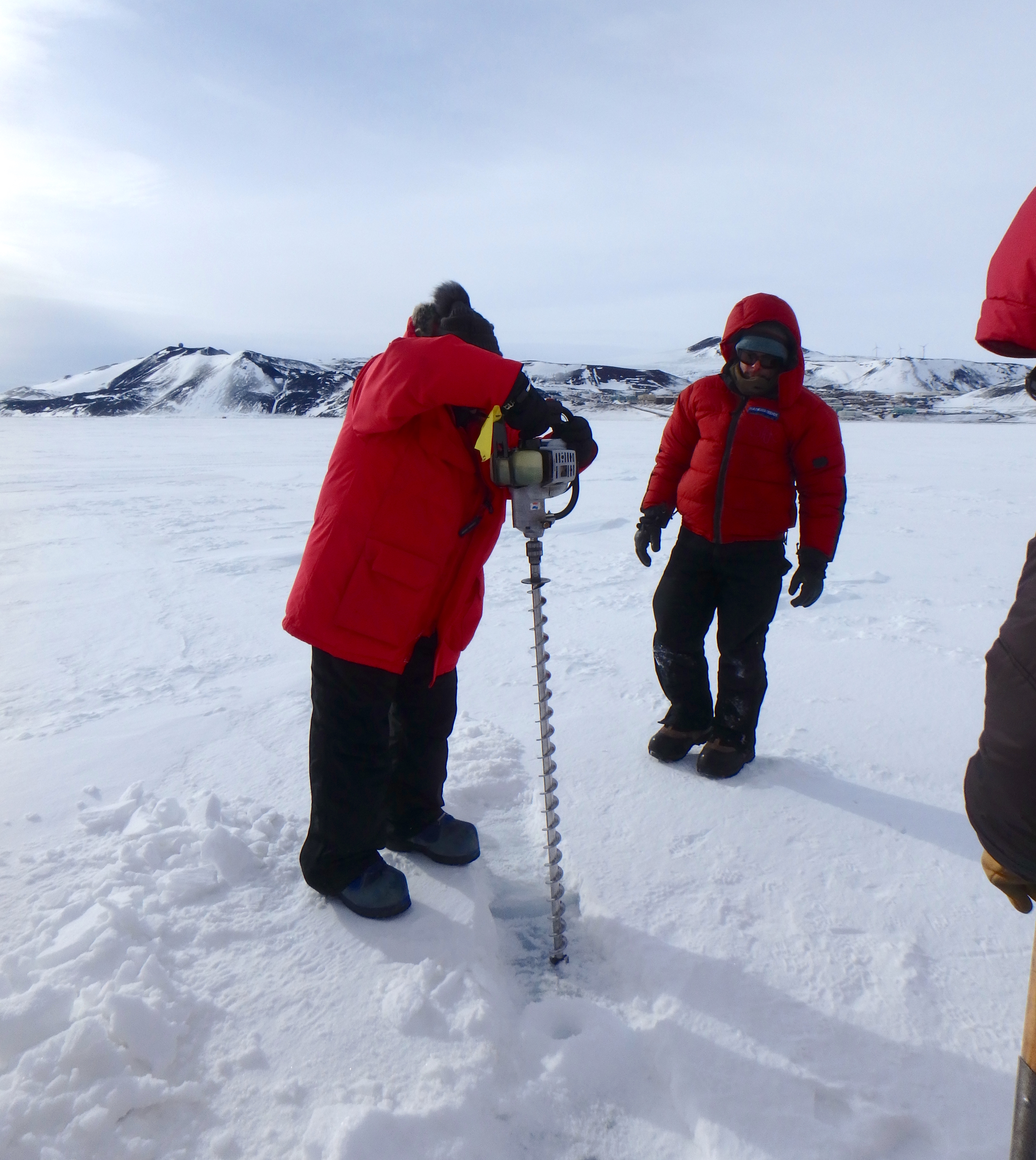 Denise Hardoy drills into the sea ice to profile an ice crack. McMurdo Station, Antarctica.
