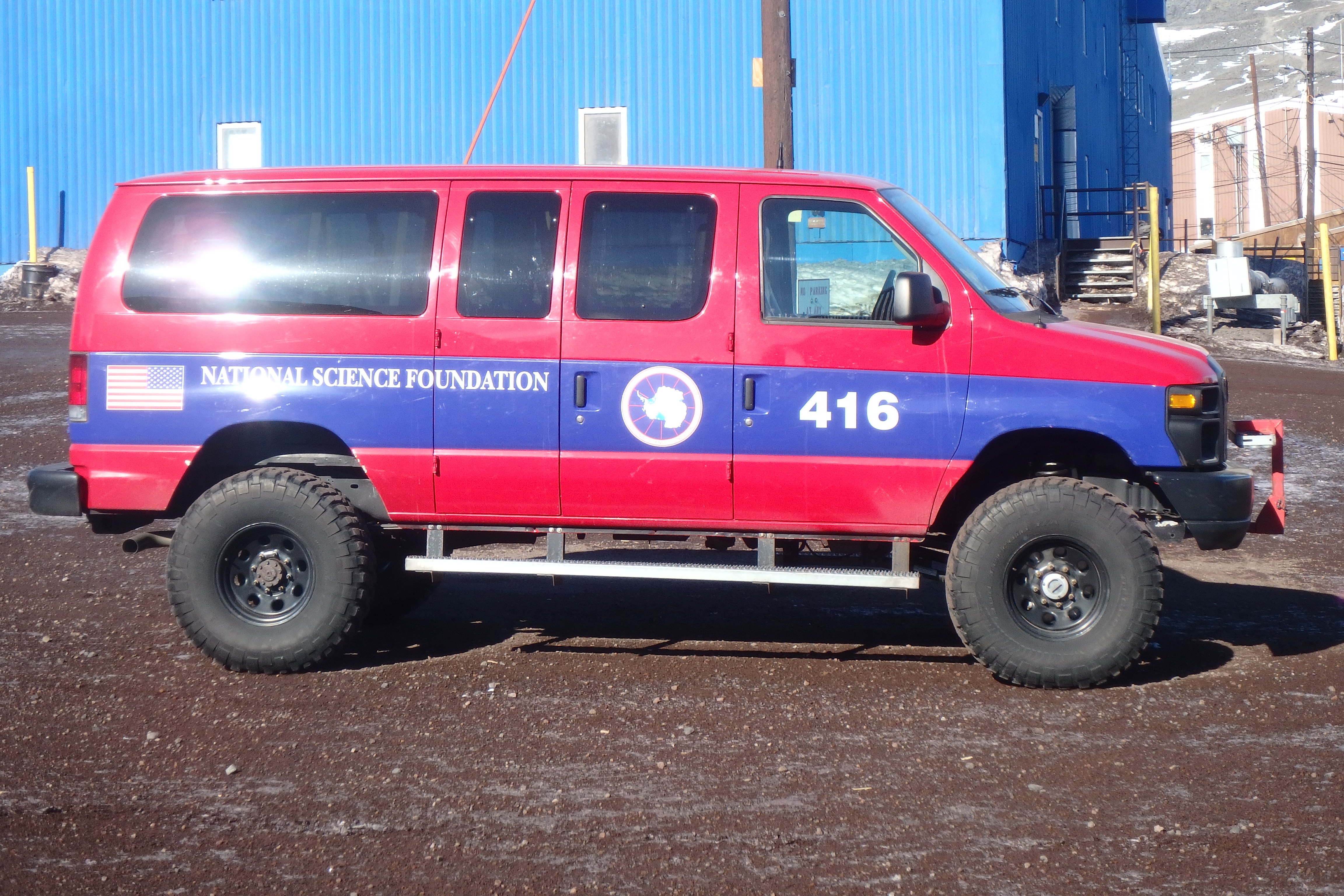 The team uses shuttles to get up to 12 people around on the main roads of McMurdo Station, Antarctica.