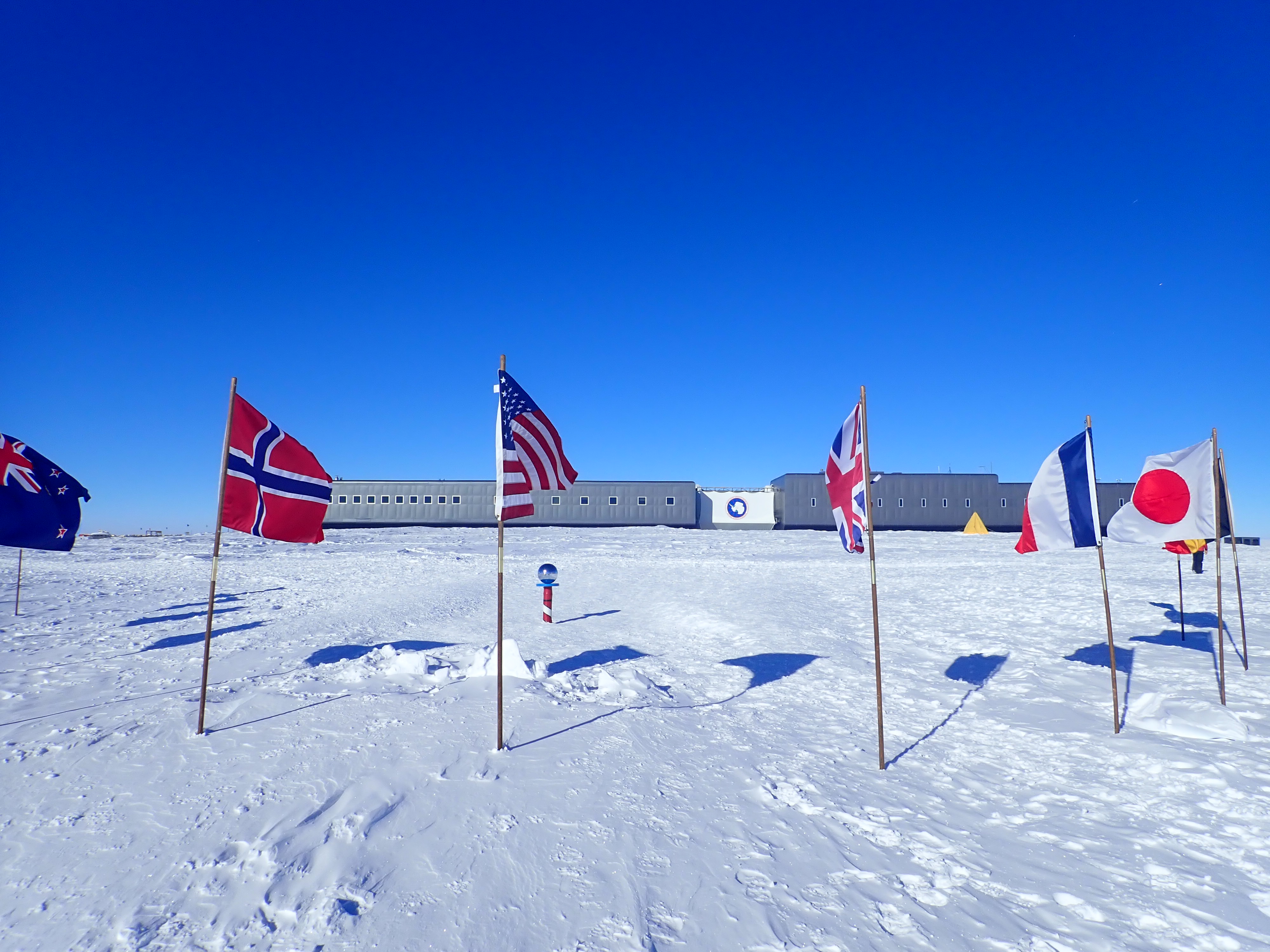 A view of the Amundsen-Scott South Pole Station as seen from the Ceremonial South Pole, Antarctica.