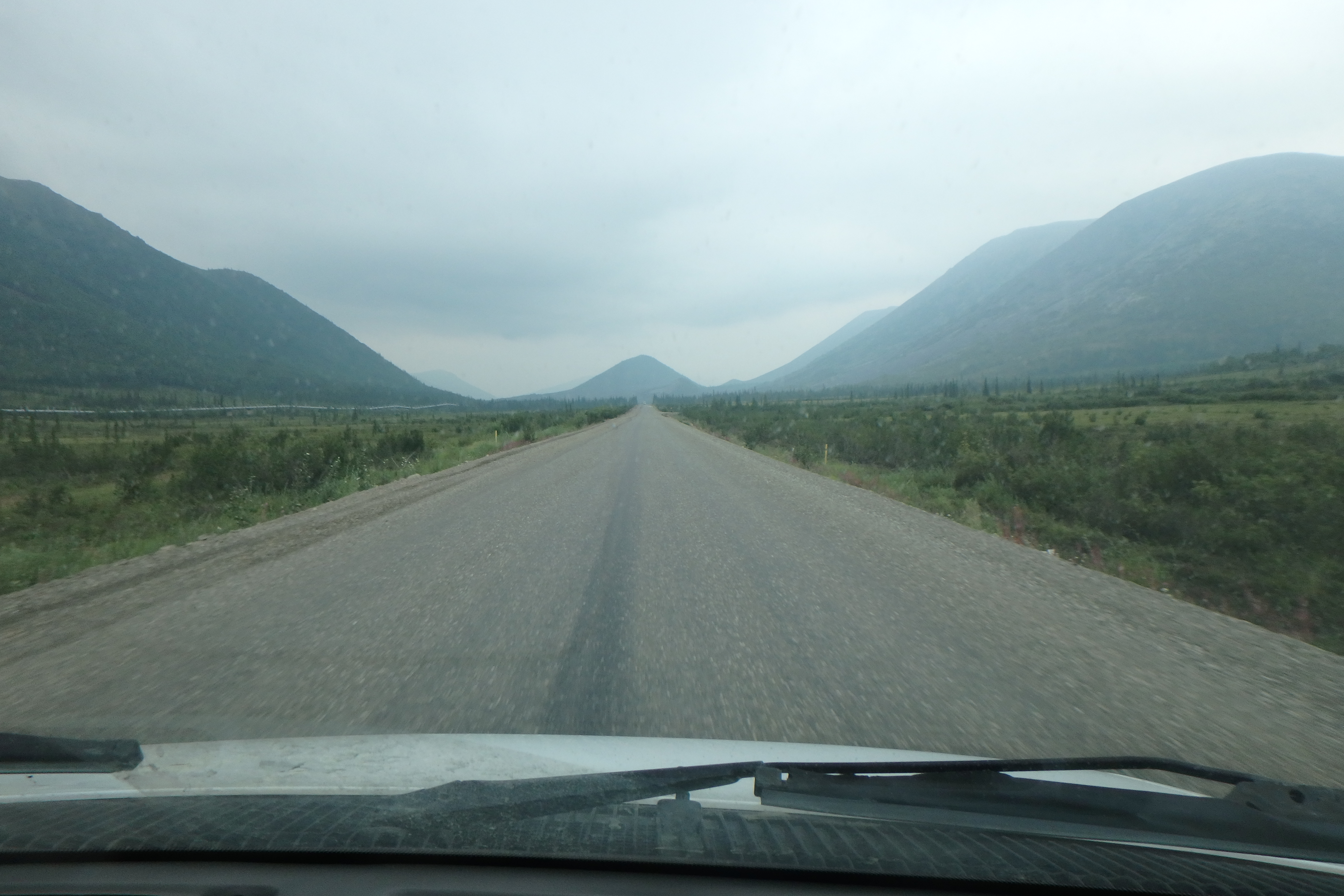 Forest fire smoke fills the valleys on the team's drive to Toolik Field Station, Alaska on the Dalton Highway.
