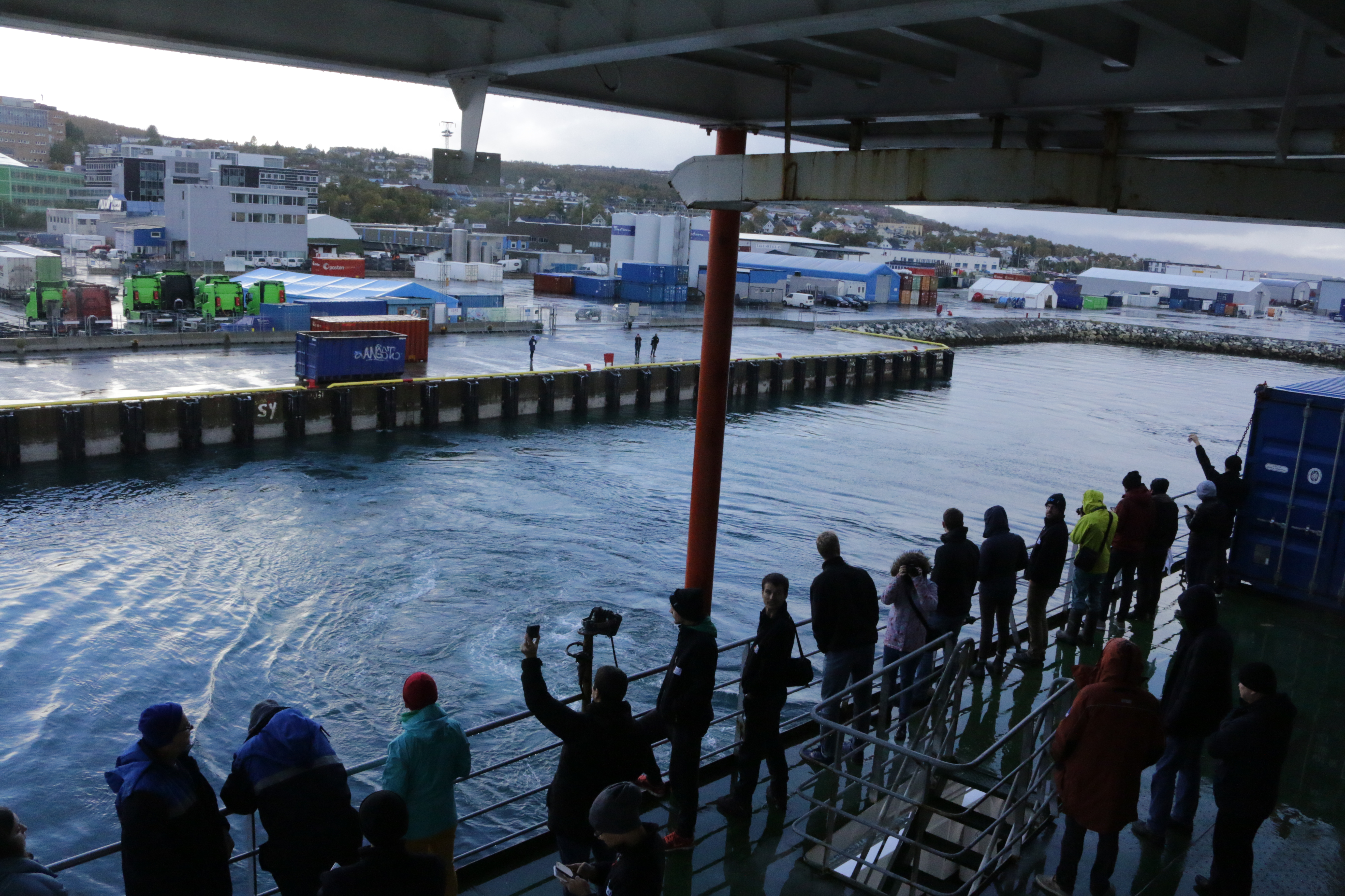 Scientists, graduate students, reporters, and crew aboard the R/V Fedorov wave goodbye as the ship departs for the Central Arctic Ocean from the Port of Tromsø, Norway.
