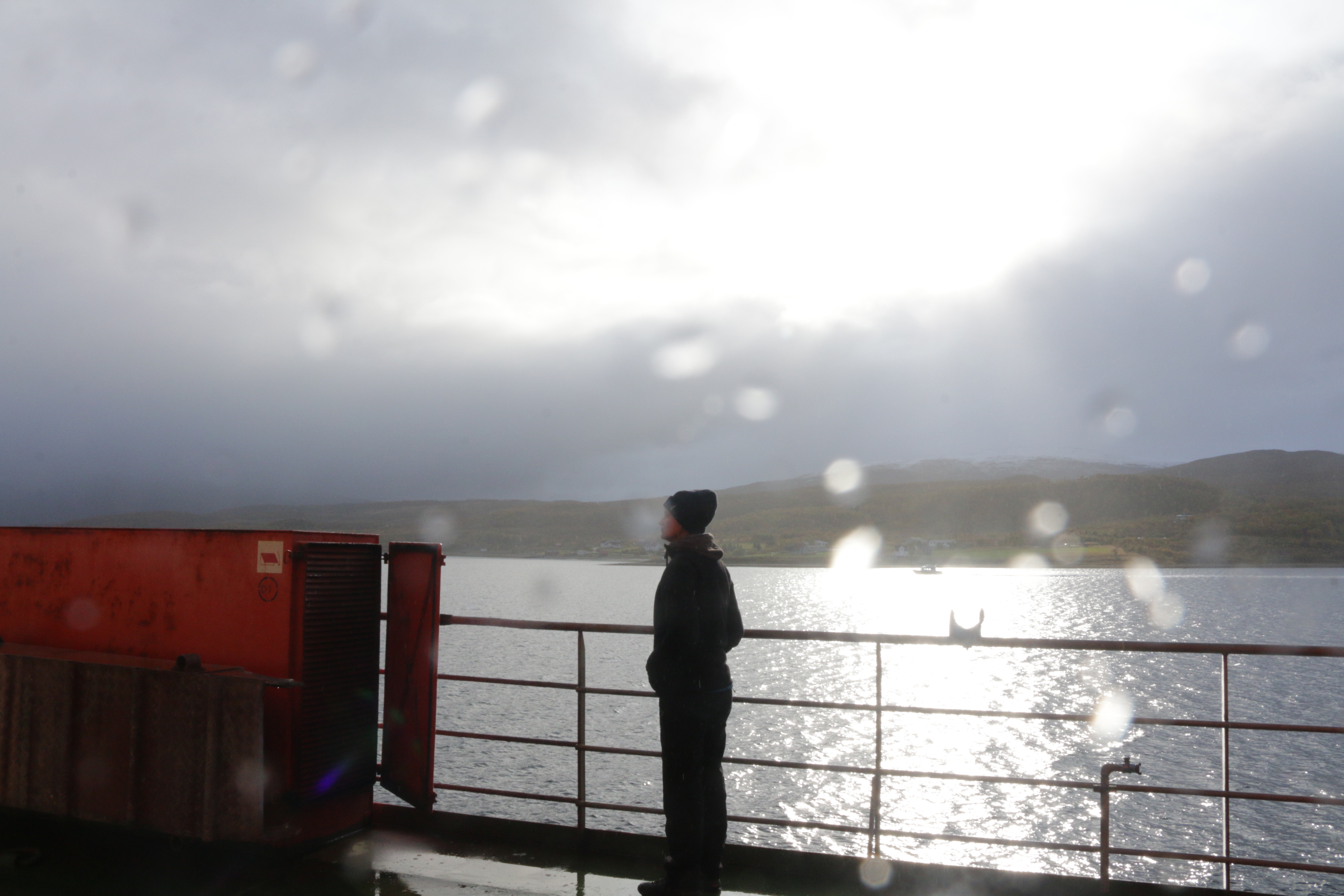A MOSAiC Expedition member on the R/V Fedorov stands in the rain to watch mountains and islands pass by. This will be the last close view of land for nearly 6 weeks. Aboard the R/V Akademik Fedorov off the coast of Tromsø, Norway.