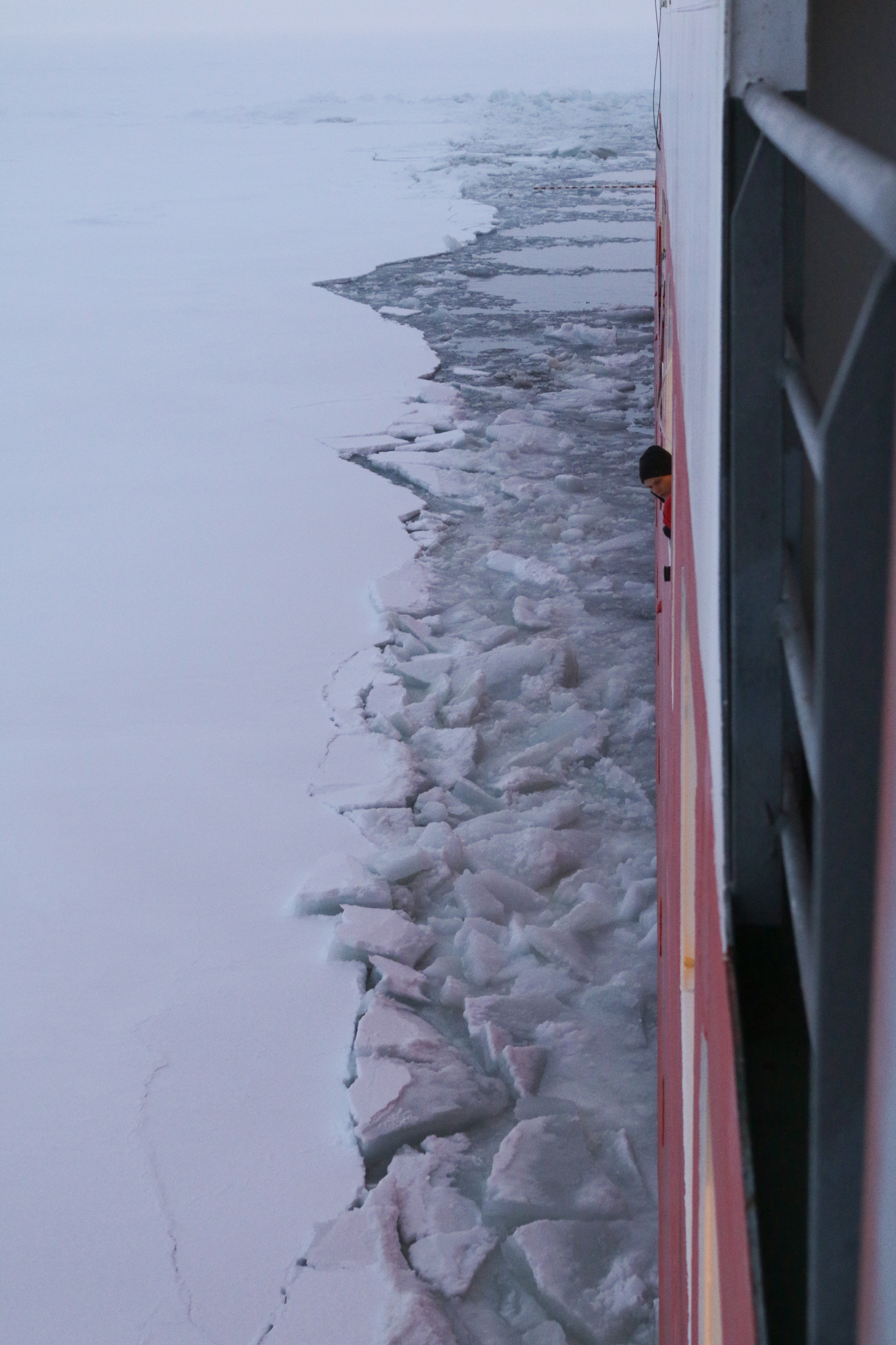 When the R/V Fedorov encounters a thick floe of sea ice, the crew puts the ship in reverse, and then use all four engines to ram the ice at full speed. Aboard the R/V Akademik Fedorov in the Central Arctic Ocean.