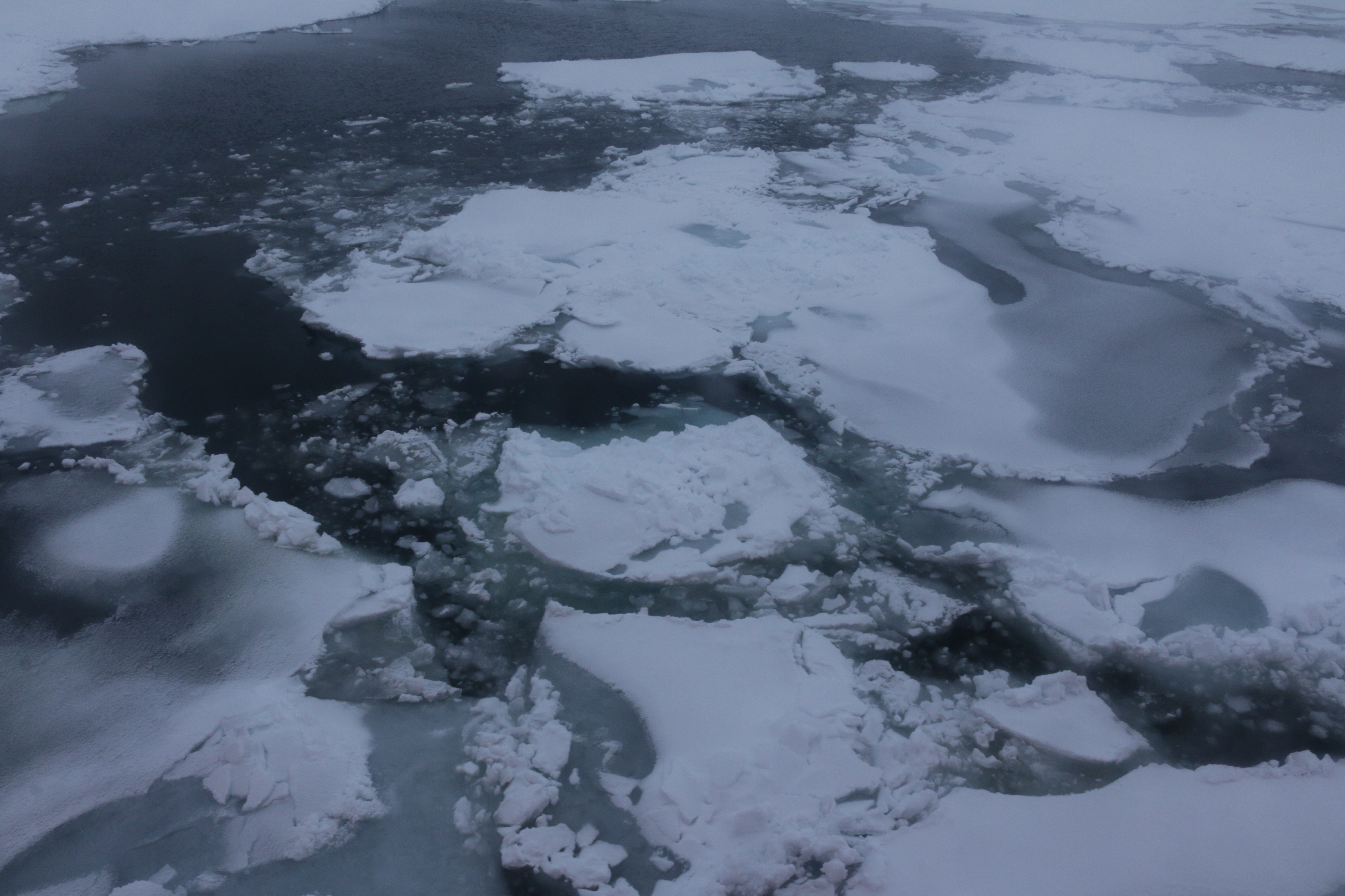 The first ice encountered is small floes of thin ice, with many leads of open water in between. Aboard the R/V Akademik Fedorov in the Laptev Sea.