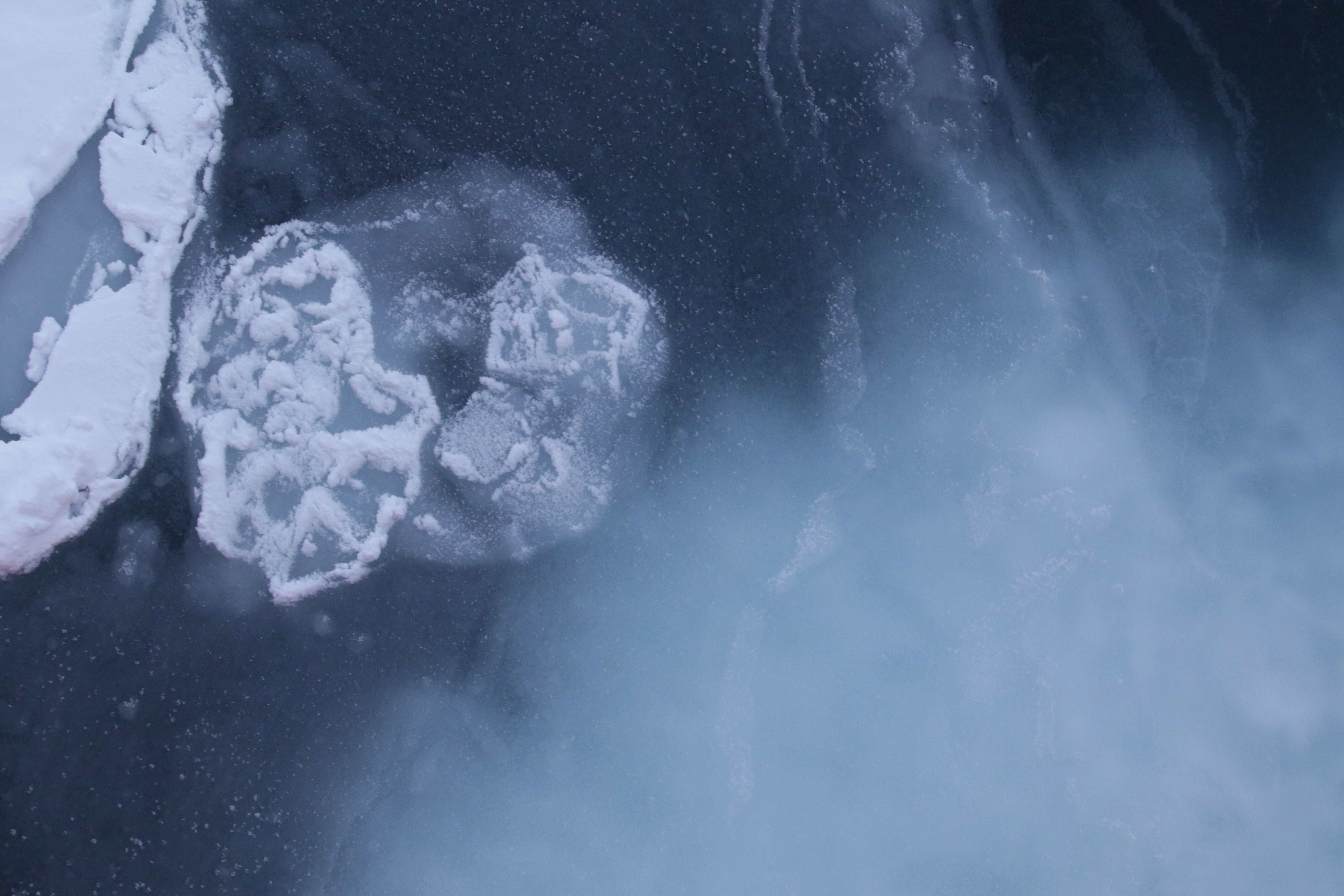 A whitish bloom of air bubbles spreads under thin sea ice as the R/V Fedorov passes through. Aboard the R/V Akademik Fedorov in the Central Arctic Ocean.