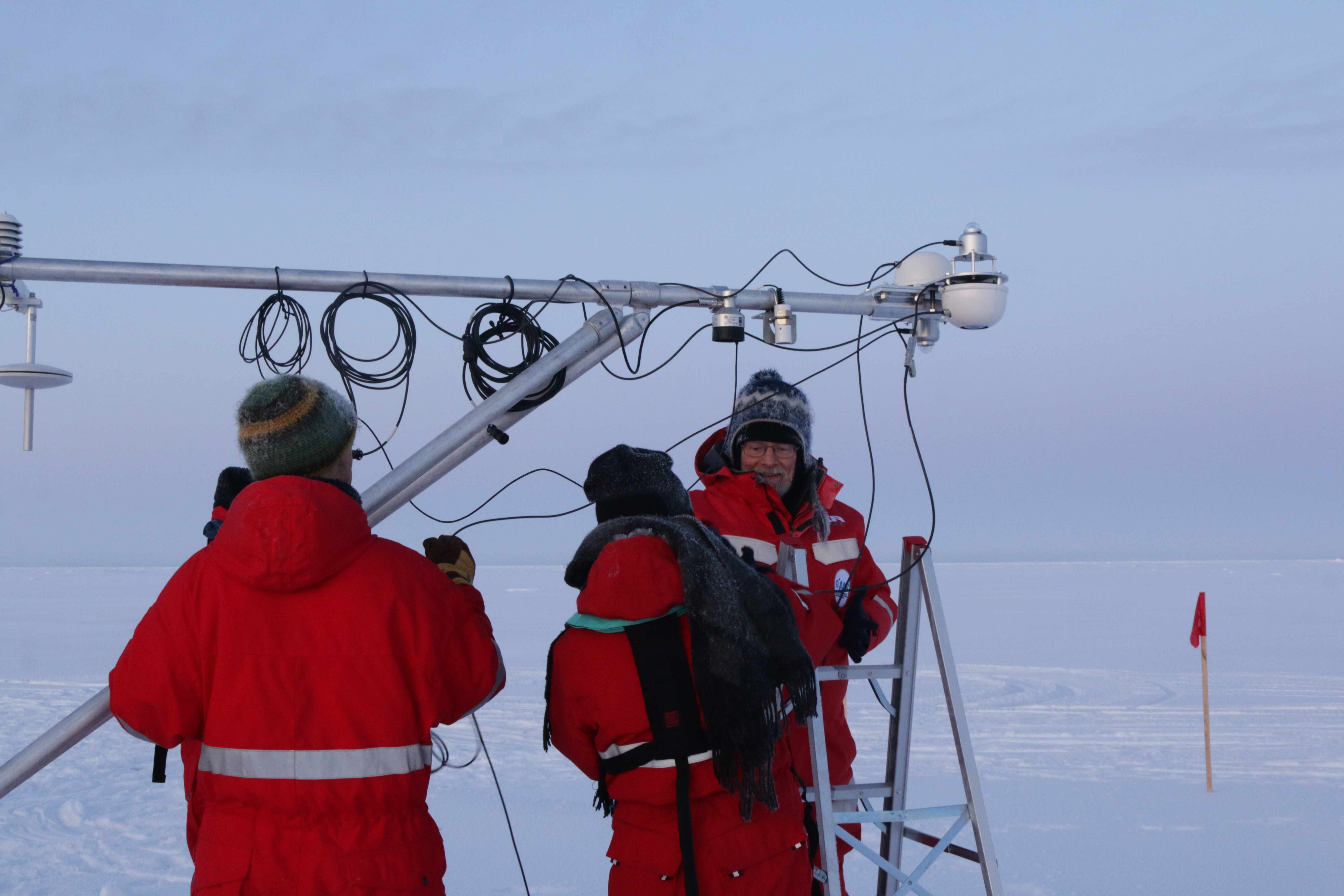 Chris Cox (left) and Ola Perrson (right) work with a graduate student to install sensors on the Atmospheric Surface Flux Station (ASFS) 'met sled' at the L1 ice floe as part of the Distributed Network. This work requires many hands to keep the cables, cords, and connectors organized and from dropping in the snow. Near the R/V Akademik Fedorov in the Central Arctic Ocean.