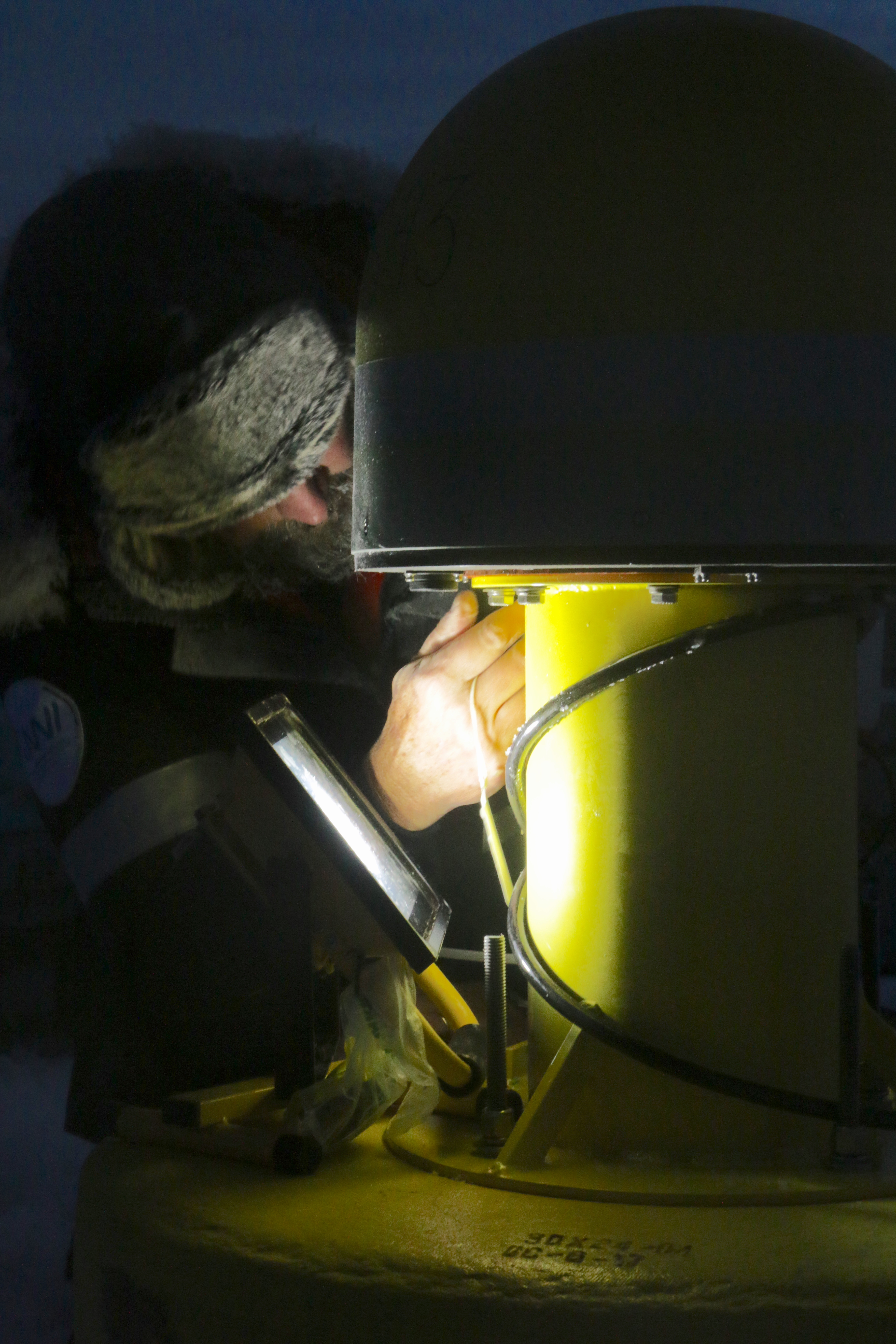 After sunset, Tim Stanton uses a flood light to finish the installation of the Autonomous Ocean Flux Buoy (AOFB). Near the R/V Akademik Fedorov in the Central Arctic Ocean.