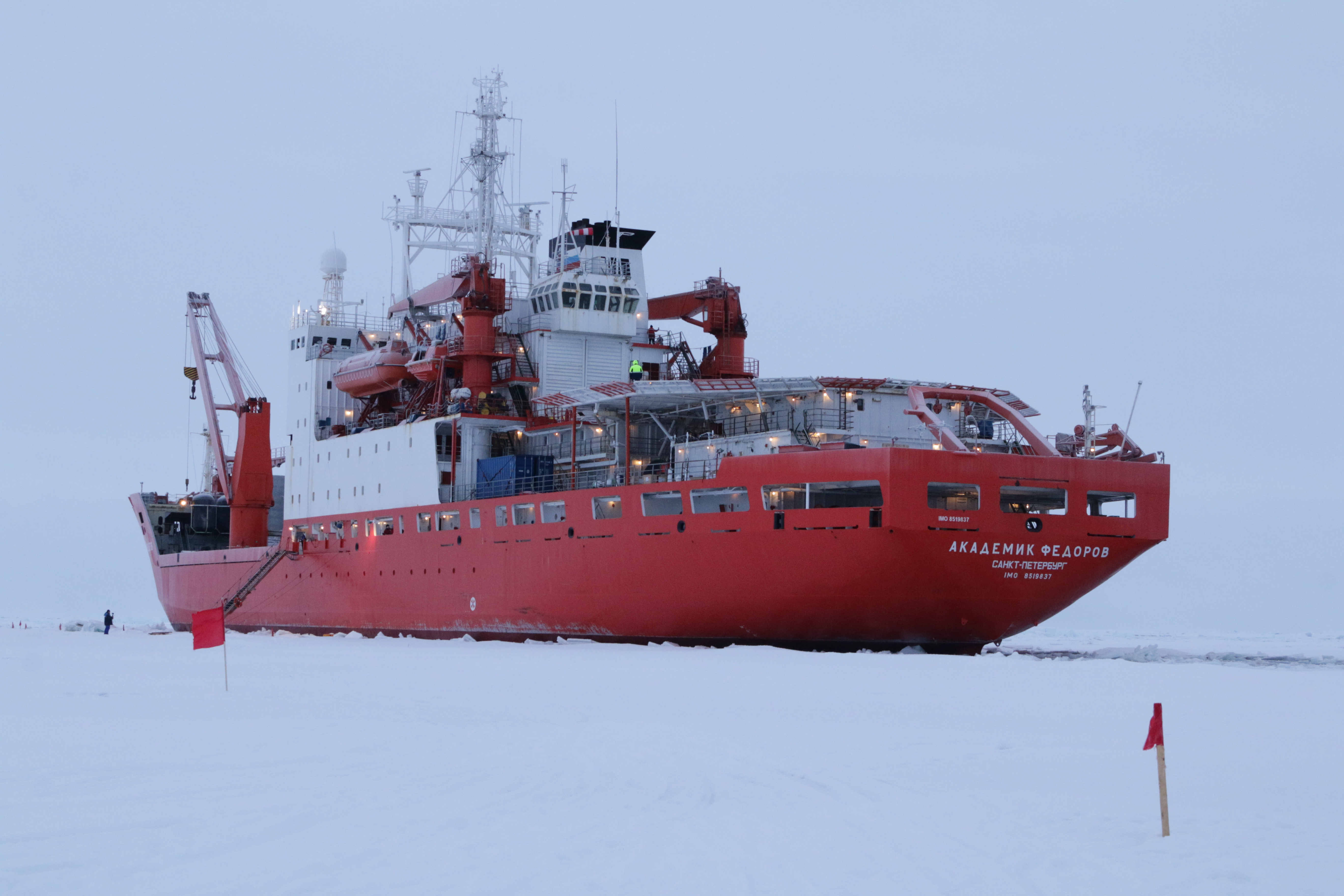 A view of the R/V Akademik Fedorov from the sea ice in the Central Arctic Ocean. Near the R/V Akademik Fedorov in the Central Arctic Ocean.