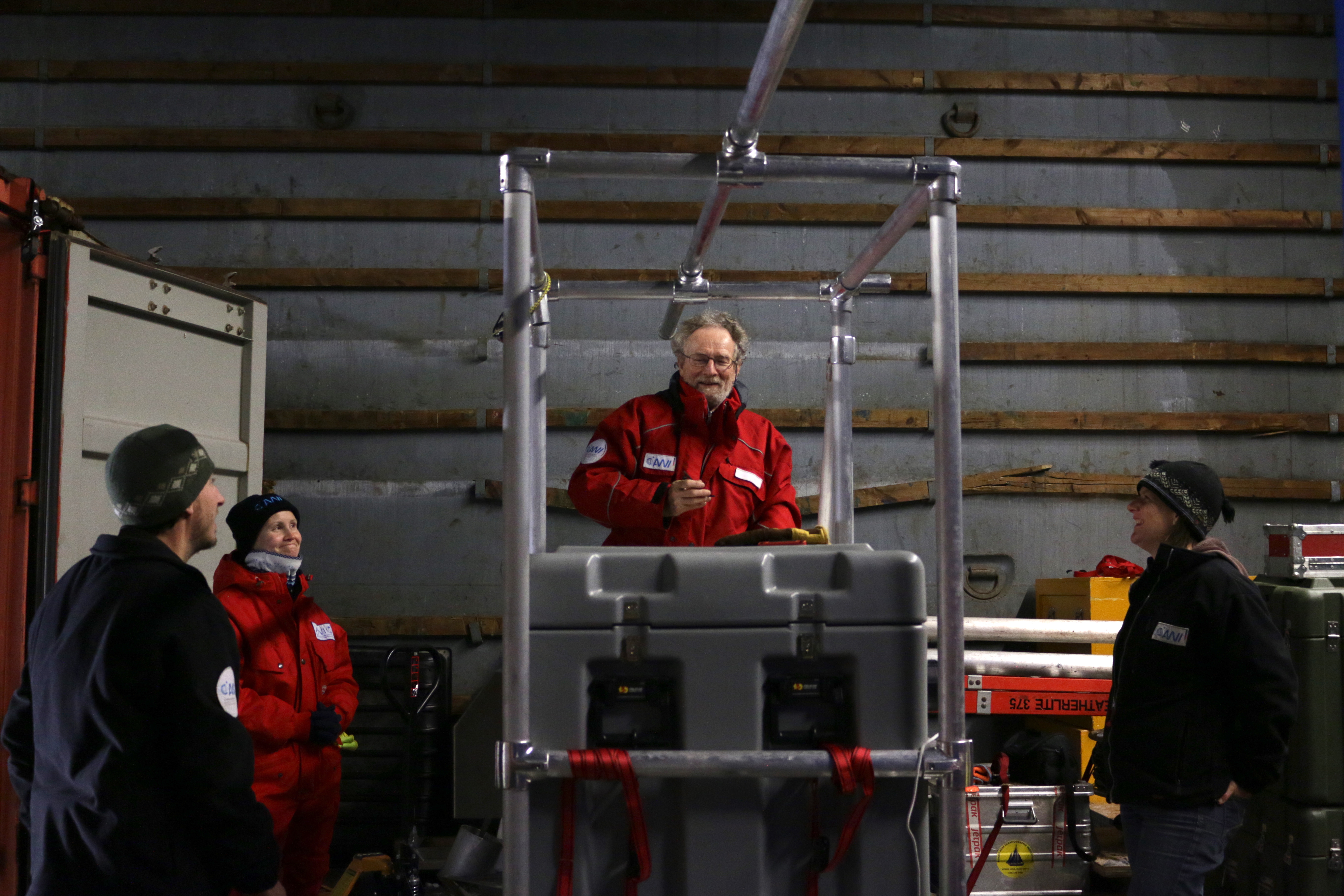Chris Cox, Tatiana Matveeva, and Anne Gold look on as Ola Perrson helps line up the boom on the second Atmospheric Surface Flux Station (ASFS). This work took place in the hold of the R/V Fedorov before the ASFS was lifted by crane onto the sea ice. On the R/V Akademik Fedorov in the Central Arctic Ocean.