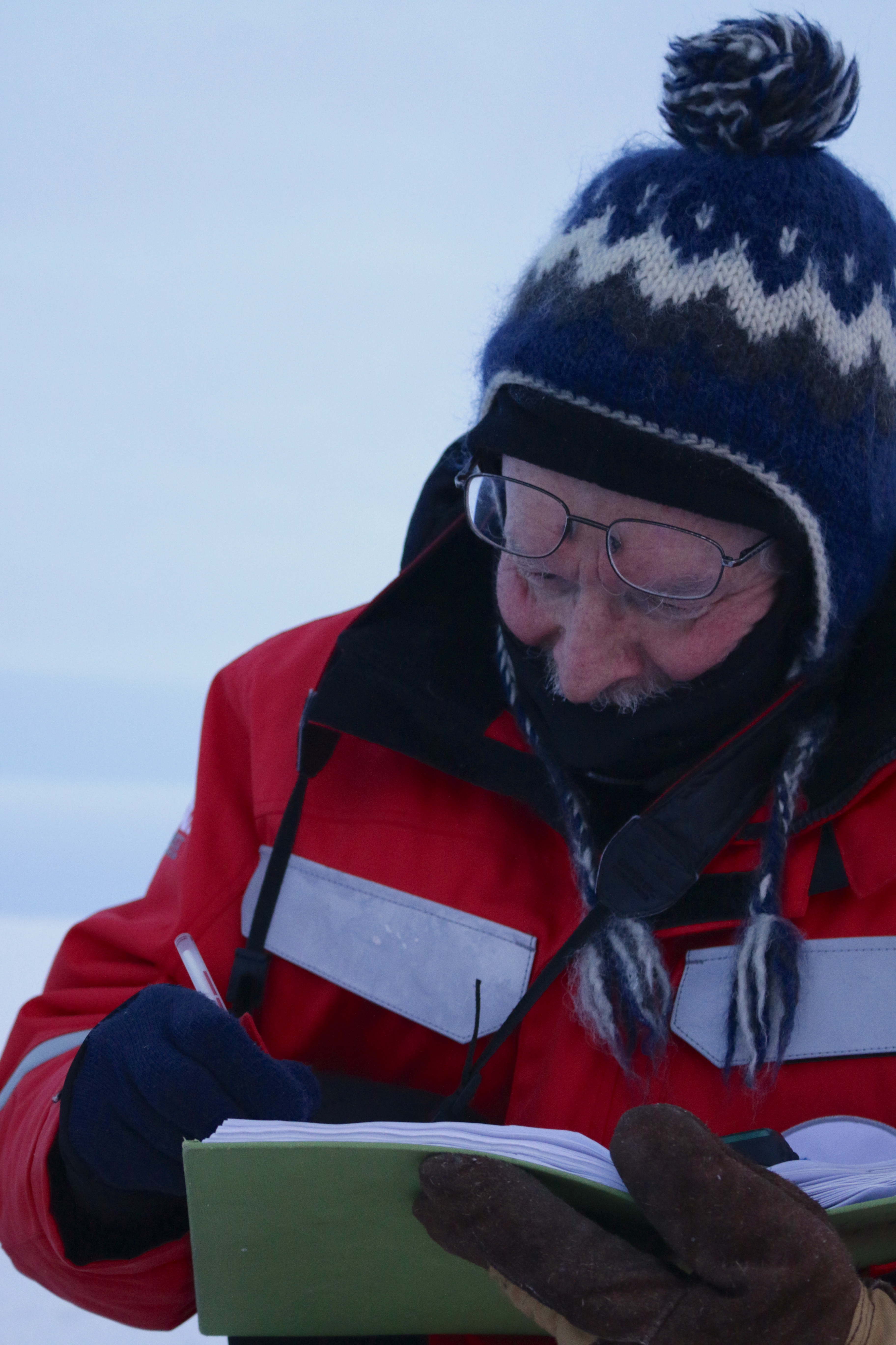 Ola Perrson, an atmospheric scientist, records snow depth measurements on the ice floe at the L2 site of the Distributed Network. Near the R/V Akademik Fedorov in the Central Arctic Ocean.