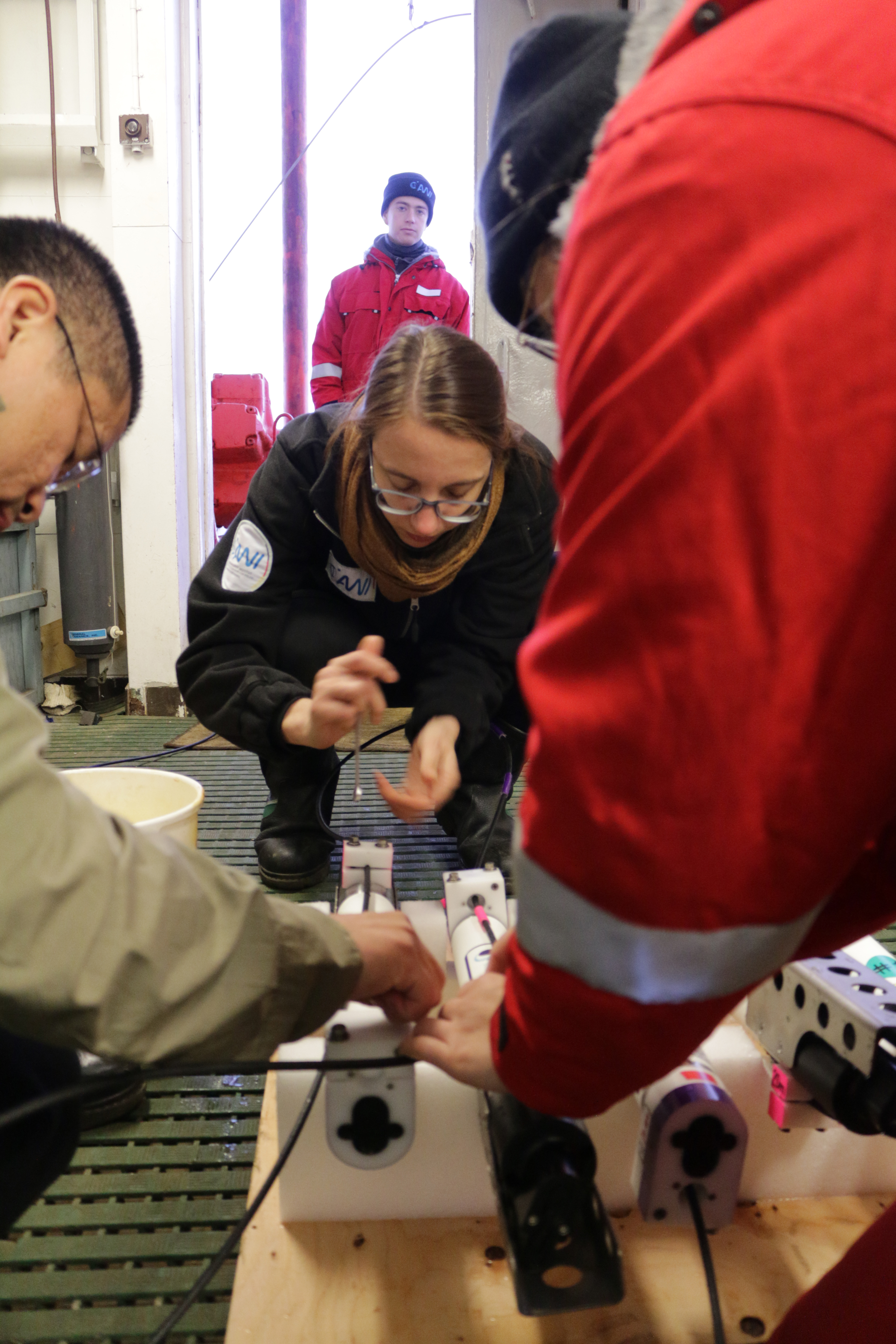 Ying-Chih Fang, Francesca Doglioni, Marylou Athanase, and Sam Cornish perform tests on FastCATs, a type of oceanographic sensor. Figuring out how to perform the tests is a challenge: the sensors need water but can't be exposed to freezing temperatures while wet. Ying-Chih Fang and his team are able to extend the cables on deck while performing the tests inside a nearby lab. Aboard the R/V Akademik Fedorov in the Central Arctic Ocean.