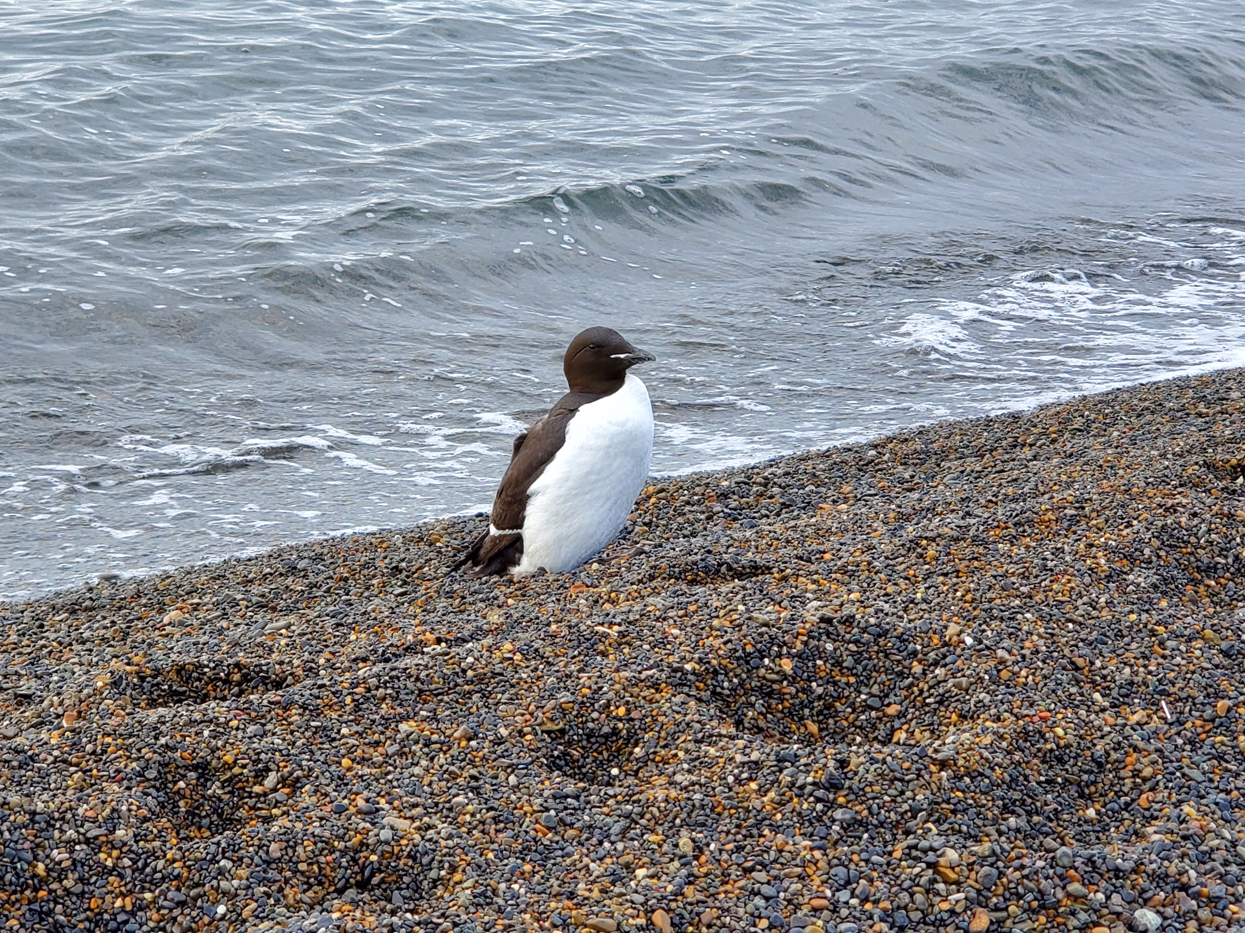 A common murre (Uria aalge) rest along the coast of the Chukchi Sea near Utqiagvik, Alaska.
