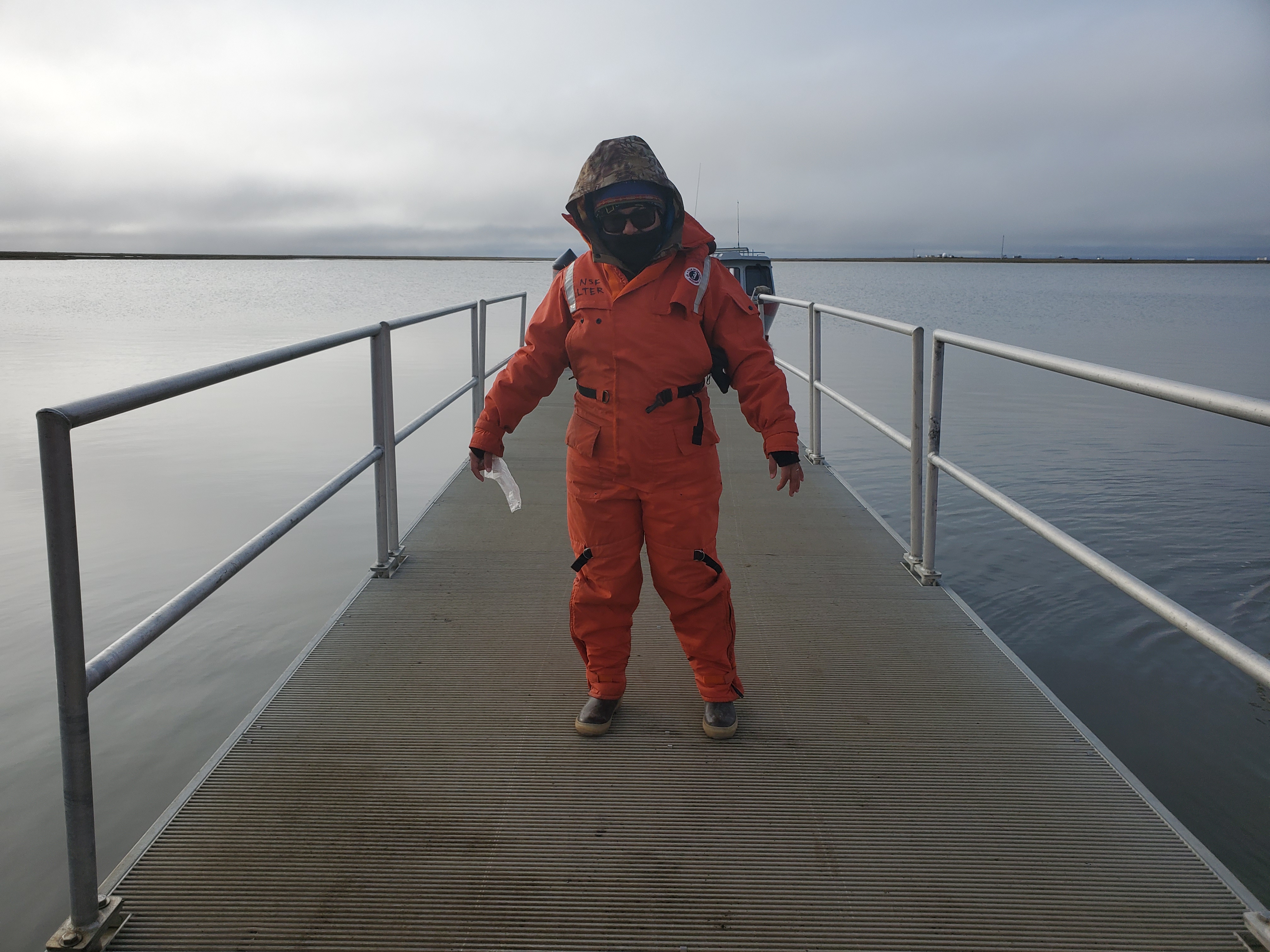 Monica Nuñez is suited up to spend the day conducting research in the Arctic Ocean. Utqiagvik, Alaska.