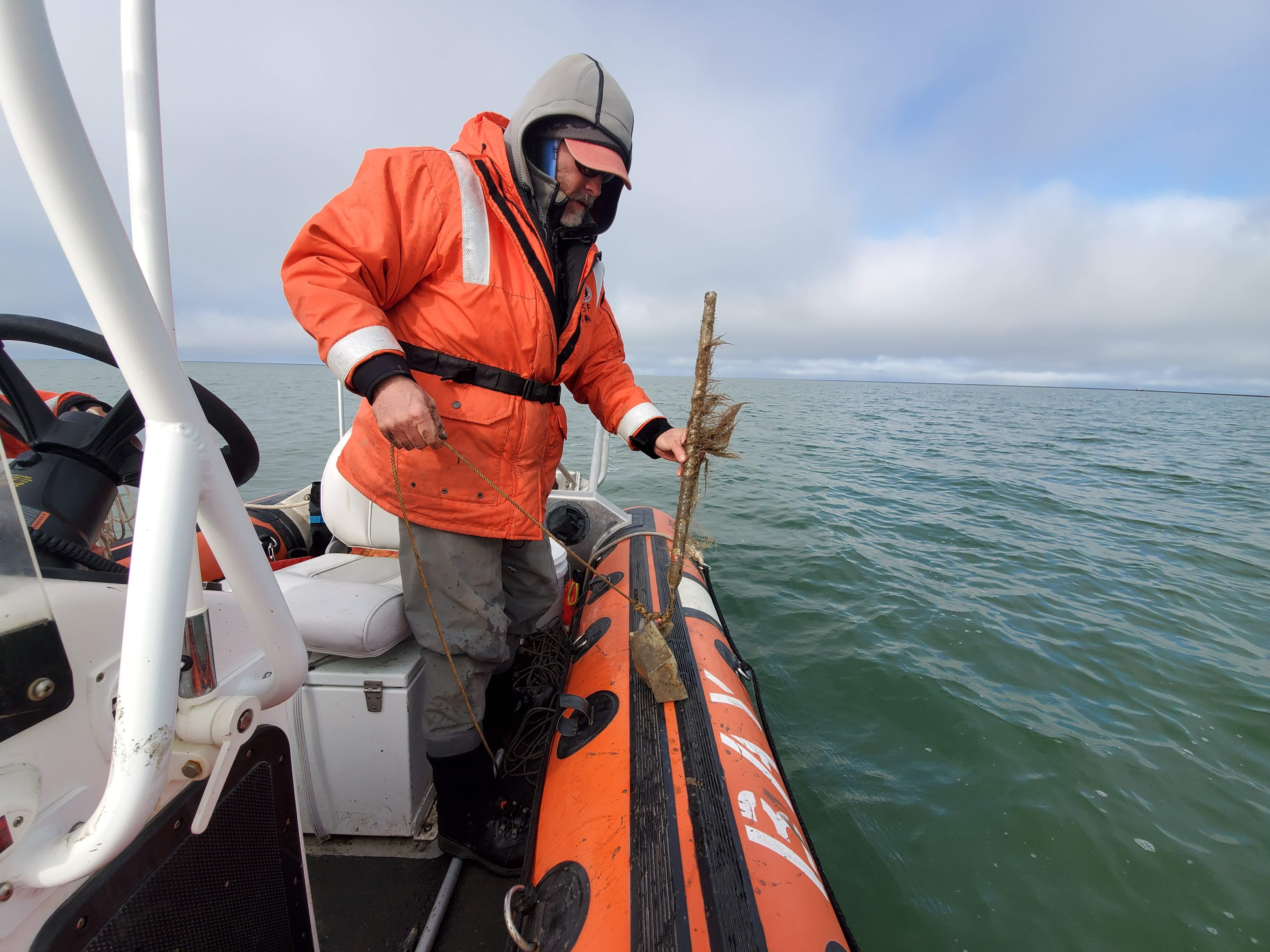 Dr. Craig Tweedie extracts a data collection mooring from the Beaufort Sea. Utqiagvik, Alaska.